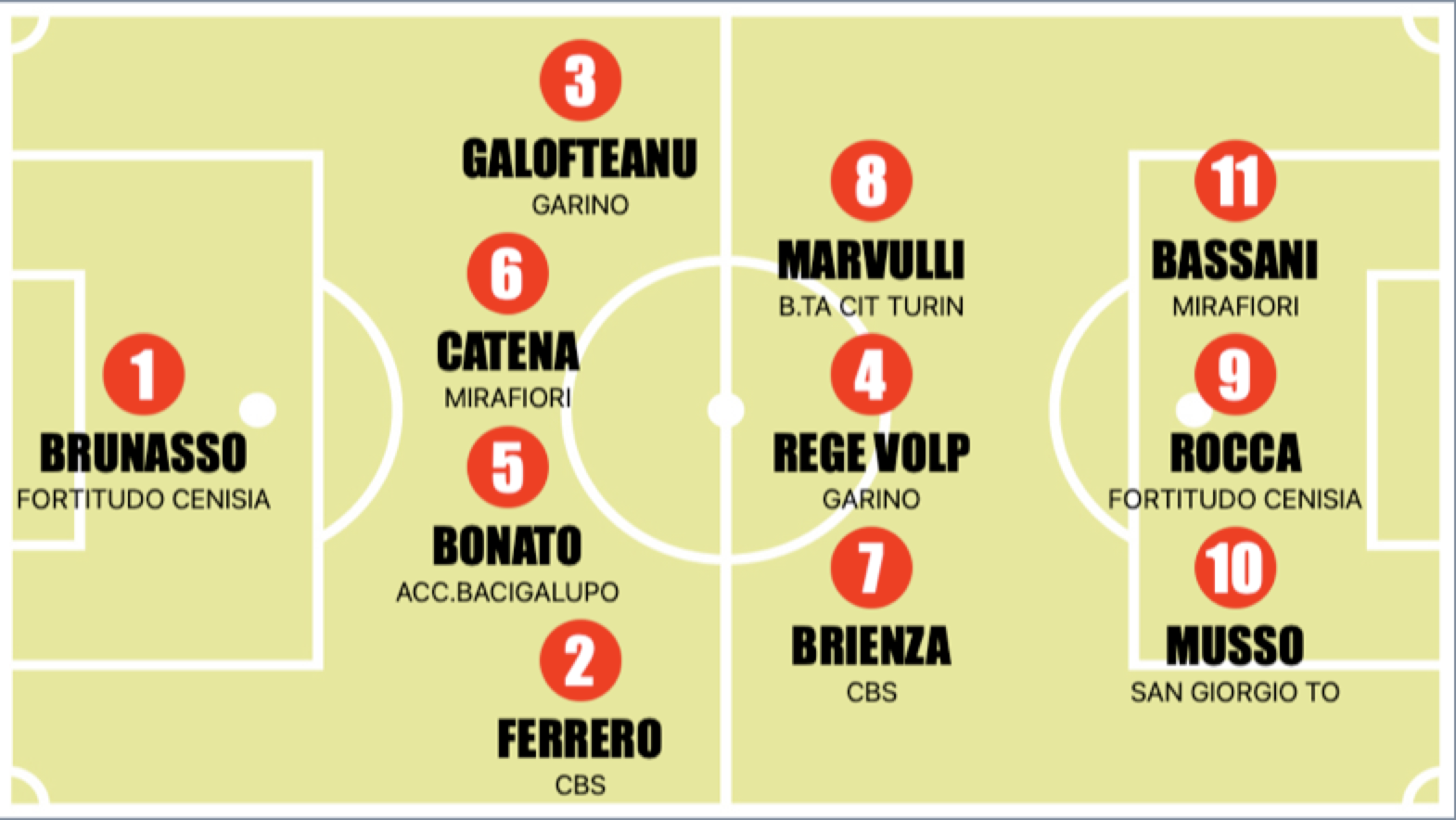 È giunto il momento di scoprire la Top 11 di Under 14 del Girone B di Torino, protagoniste in questa formazione ideale sono le due grandi favorite per la lotta al campionato, Garino e CBS, con due giocatori a testa, così come per il Mirafiori di Samuele Peisino, squadra ancora imbattuta e seconda forza del girone, seguono con un giocatore schierato per squadra l'altra formazione seconda in classifica, il San Giorgio, l'Accademia Bacigalupo e il Borgata Cit Turin. A stupire, però, in questa Top 11 è la grande sorpresa di questo inizio di stagione, la Fortitudo Cenisia, quinta in classifica e autrice di un ottimo avvio per una squadra appena fondata, e che porta ben due giocatori in questo 11 ideale, il portiere e la prima punta. Vediamo dunque quali sono stati i giocatori chiave per i risultati delle proprie squadre in questa prima parte di campionato.
