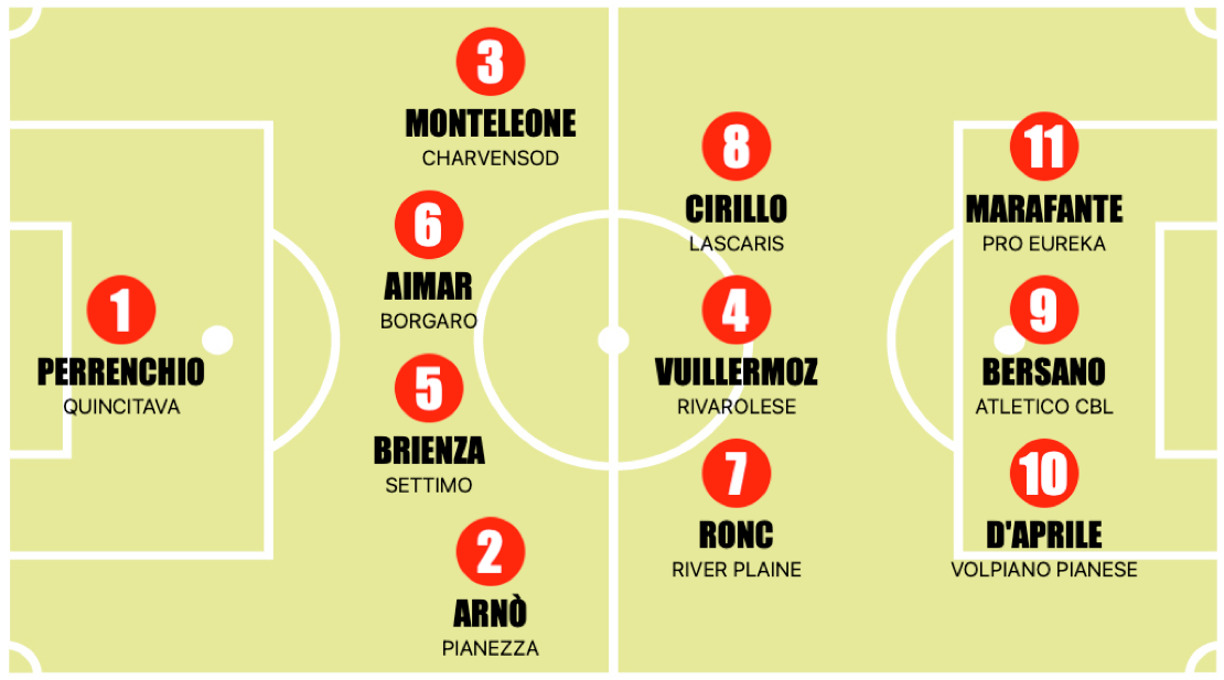 Per fare calcio serve qualità in mezzo al campo ed ecco che Philippe Ronc fa al caso nostro: il capitano del River Plaine ha carattere e leadership da vendere, 7 presenze e un gol per lui. Giacomo Vuillermoz è il giocatore più utilizzato da Stefano Cosentino della Rivarolese: 7 presenze e 445 minuti giocati, nessuno come lui in squadra. Qualità e gol per sfondare le difese avversarie, Alessio Cirillo è il centrocampista modello di cui ogni squadra non può fare a meno: 7 presenze e 5 gol, numeri da capogiro.