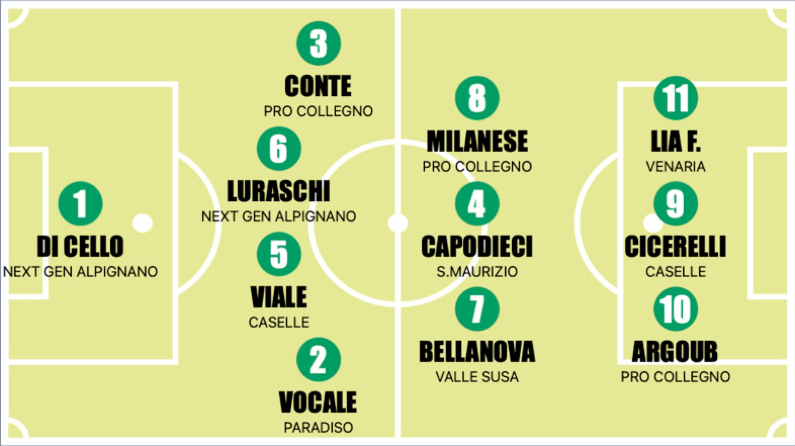 Partiamo quindi dal numero uno, da chi tra i pali è letteralmente volato in una gran quantità di situazioni per la sua squadra. Si perchè Di Cello, nonostante la Next Gen Alpignano abbia perso qualche punticino per strada, molto spesso ha tenuto a galla i suoi in situazioni molto complicate, come nell'ultimo turno di campionato contro il Paradiso senza però evitare la sconfitta. Come se questo non bastasse, il numero uno biancazzurro è riuscito a mantenere la rete inviolata per ben 4 volte (al pari con Gianluca Taglialatela del Leinì), più di chiunque in questo girone.