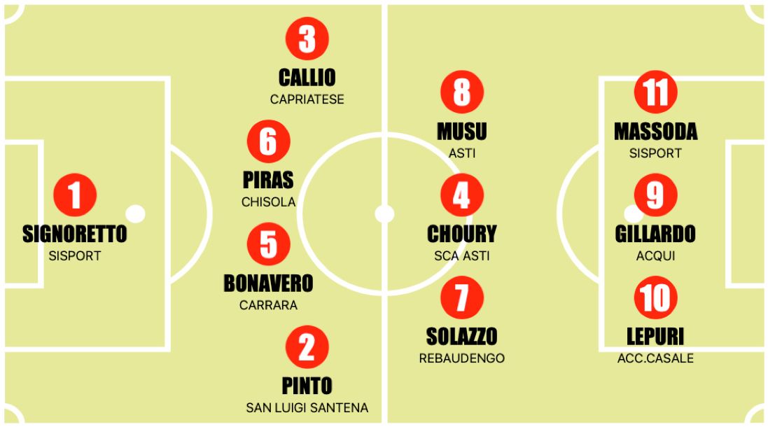 Dall'Asti sicuramente un posto se lo prende Tommaso Musu. Protagonista con i Galletti, decisivo davanti anche in fase offensiva dove punta sempre il fondo cercando la porta. Accanto a lui Lorenzo Sollazzo, del Rebaudengo, decisivo nella prima vittoria ai regionali della sua squadra (doppietta nel 5-0 sulla Torinese). Play della squadra che detta il gioco, è anche bravo a farsi vedere davanti. Padrone del centrocampo gialloblù. Infine, Hossam Choury, della Sca Asti. Due gol per uno dei protagonista di una delle squadre che più stanno sorprendendo in questo girone (quarto posto dietro a corazzate come Sisport, Chisola e Asti).