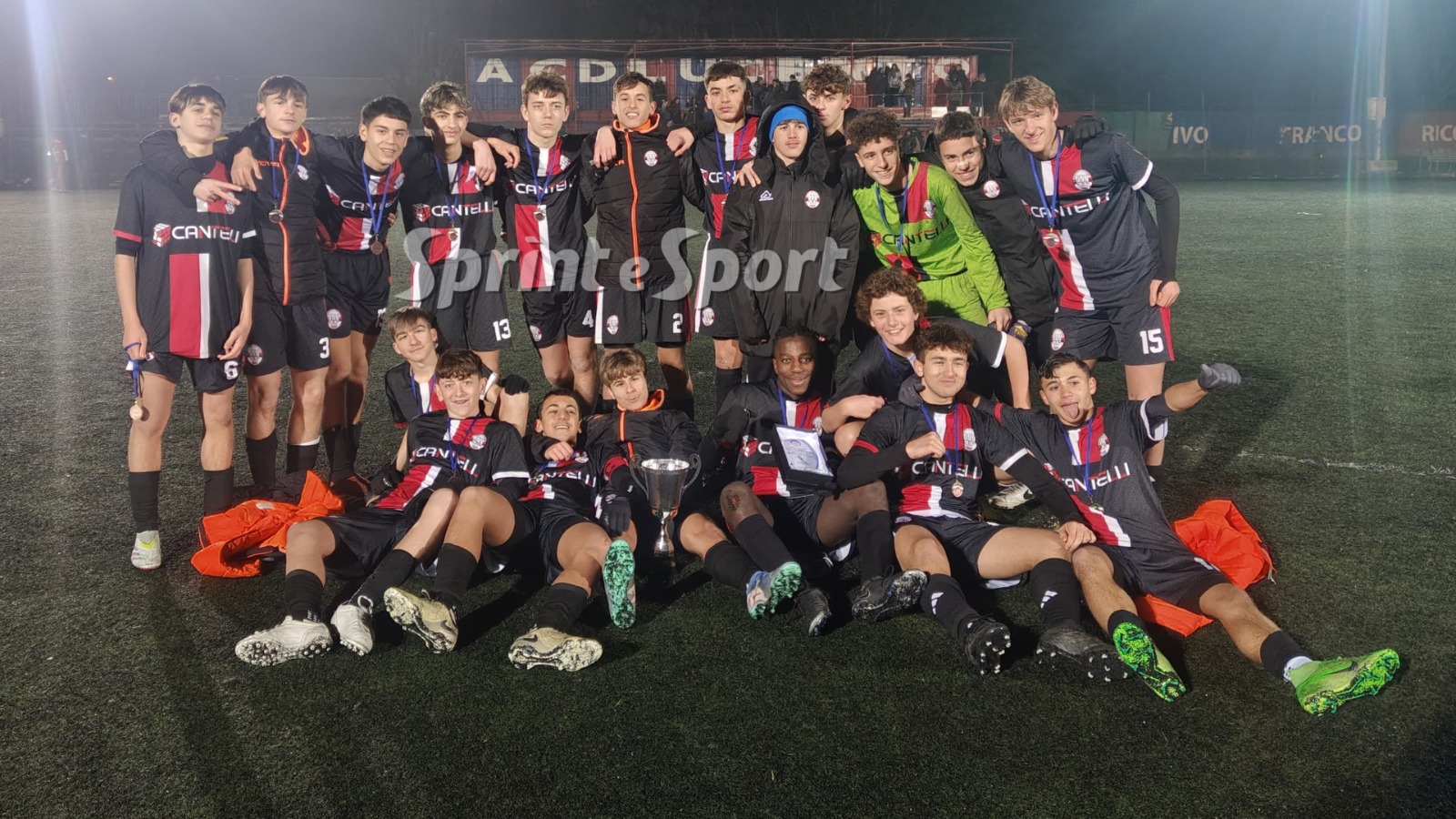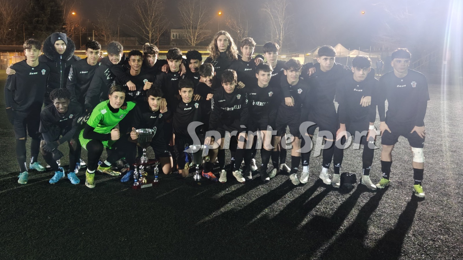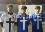 A sinistra Gioele Benevento, Alessandro Rua e Jacopo Caramassi, 3 tra i migliori in campo nella semifinale del 43° Memorial Pier Giorgio Tappari vinta ai rigori 8-7 dalla Rappresentativa Piemonte VdA Under 15 contro la Juventus, a destra parte della squadra che festeggia l'accesso in finale contro la Pro Vercelli