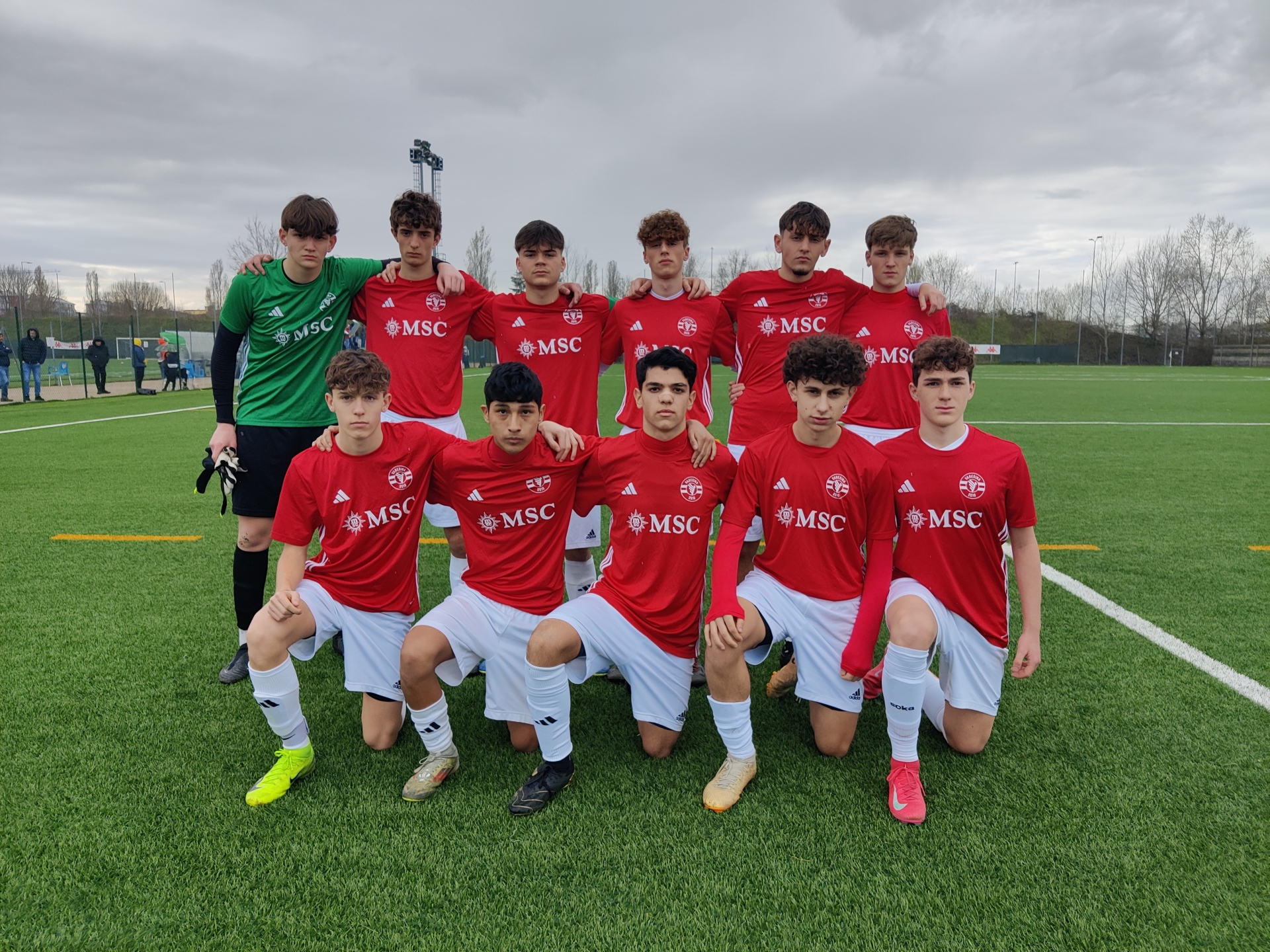 Le due formazioni partono forte, mettendo subito in mostra la loro qualità, figlia dei bei fraseggi in mezzo al campo e qualche dribbling degno di nota. Le due compagini, dopo una prima fase di studio fatta di contrasti in mezzo al campo, provano a portarsi all'attacco: il Rozzano con le combinazioni firmate dal trio offensivo Renna Marco, Fugazza e Maiorano e l'Accademia Varesina con i bei scambi sulla fascia sinistra della coppia Busetto-Anchimanya Cano. L'inizio del primo tempo è scevro di emozioni ma ecco che allo scoccare del decimo minuto di gioco arriva l'eurogol di D'Angelo che, ragionato sul da farsi arrivato sulla trequarti avversaria, decide di rilasciare un missile terrificante che beffa l'estremo difensore dell'Acc. Varesina. Gol pazzesco del difensore biancoverde e 1-0 per il Rozzano. Gli ospiti non sembrano aver subito il colpo mentale del gol e continuano a riproporsi in avanti ma con poca qualità: begli scambi tra difesa e centrocampo ma che una volta arrivati sulla trequarti avversaria si spengono per imprecisioni o interventi puntuali della difesa rozzanese. E da queste imprecisioni nasce anche qualche rischio: Capuzzo, ad altezza centrocampo, sbaglia il passaggio consegnando la palla agli avversari e innescando così il contropiede di Renna Marco che viene, però, chiuso bene dai centrali biancorossi (21'). Nella seconda parte del primo tempo torna a farsi aggressivo il Rozzano grazie ai grandi interventi a centrocampo di Petruzzelli che, recuperato il pallone, tenta più volte di innescare Renna Marco con filtranti al bacio. Attenta, tuttavia, la difesa ospite. Continua a spingere il Rozzano e al 30' Benassi effettua una rimessa intelligente, in grado di liberare al tiro Maiorano che colpisce clamorosamente la traversa. Dopo tre minuti di stallo viene fischiato un calcio di rigore in favore dei biancoverdi: Renna Marco viene atterrato in area di rigore, secondo l'arbitro fallosamente. Dagli undici metri si presenta Maiorano che spiazza il portiere, consegnando il 2-0 alla propria squadra. Sul finire del primo parziale prova a crederci l'Accademia Varesina che effettua una bella azione corale che porta al gol, tempestivamente annullato però per posizione di fuorigioco dell'attaccante biancorosso.
