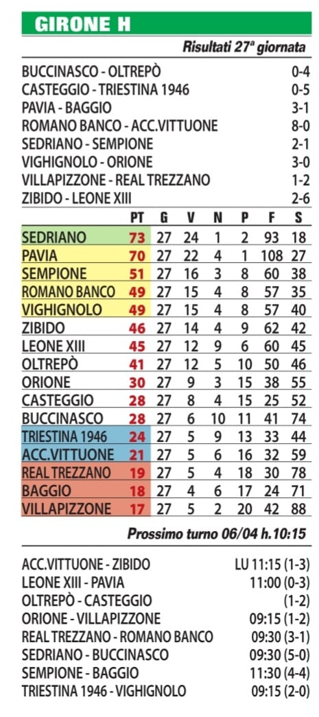 Altro giro altra goleada, ma questa volta un po’ più in basso in classifica, di preciso ci troviamo in zona playout, dove la Triestina ha firmato una manita da sogno a danni del Casteggio. La truppa di Fiore conquista tre punti chiave per la corsa salvezza con le firme di Guarino, Lopopolo, Scalese (autore di una doppietta) e Barba, con l’uscita dalla ‘red zone’ che ora dista solo 4 lunghezze per i biancorossi. Spettacolo anche dalle parti di Buccinasco, dove il Romano Banco ha firmato un risultato da capogiro collezionando 8 reti a danni dell’Accademia Vittuone. Da segnalare per i biancoverdi una prestazione clamorosa della coppia Bertocchi-Bellini, autori di 7 reti in due, numeri da capogiro che firmano il +3 per i loro.