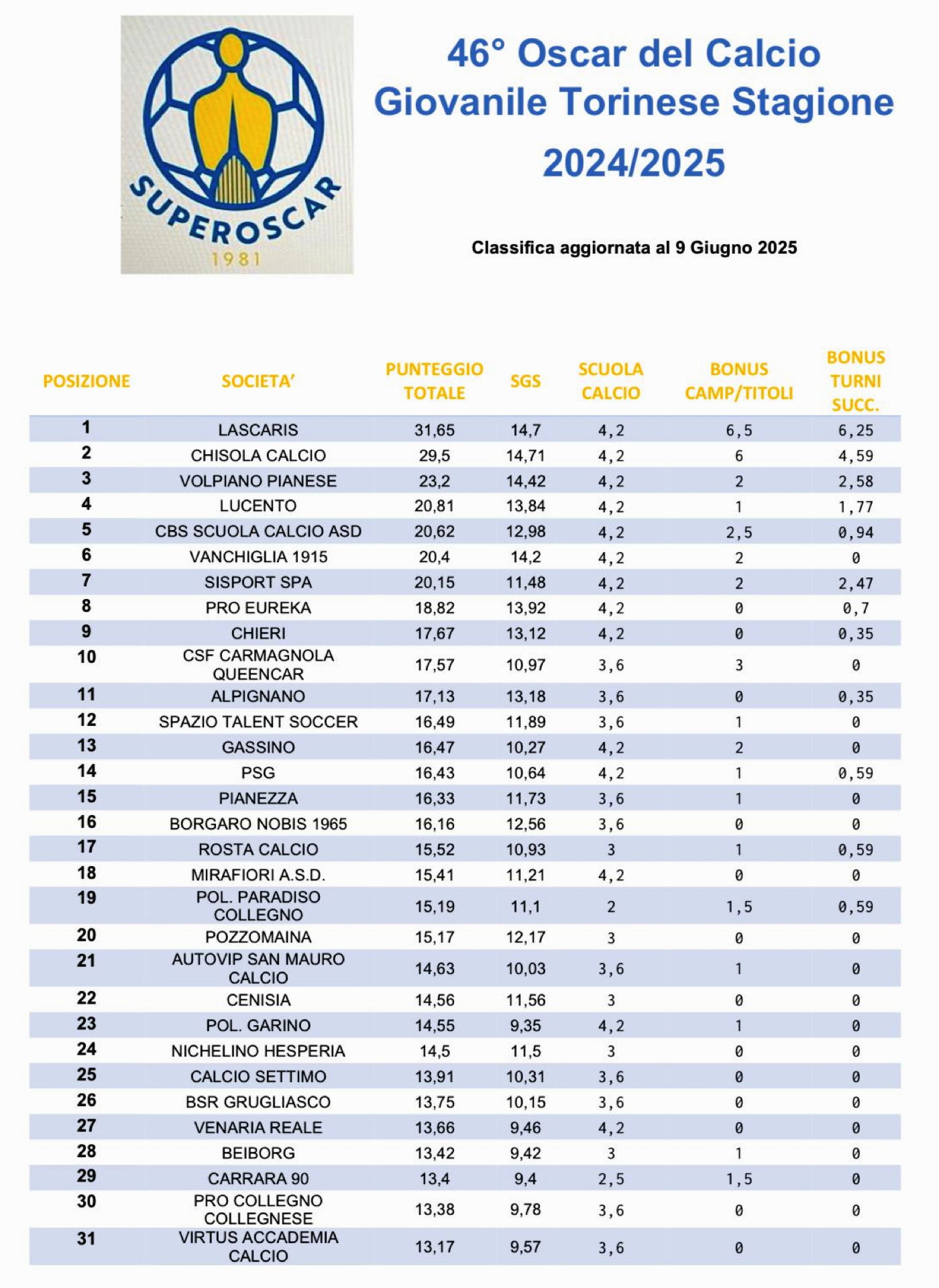 Come spiegato più volte, le partecipanti al SuperOscar sono l'emanazione della classifica dell'Oscar, graduatoria compilata sommando i risultati sportivi di tutte le categorie delle società torinesi, dalla Under 19 ai Pulcini. Dunque le prime 16 società della 46ª classifica dell'Oscar sono le 16 partecipanti al 45° SuperOscar, avremo così, dividendo anche i club nelle 4 fasce in base alle quali verranno composti i gironi, categoria per categoria: