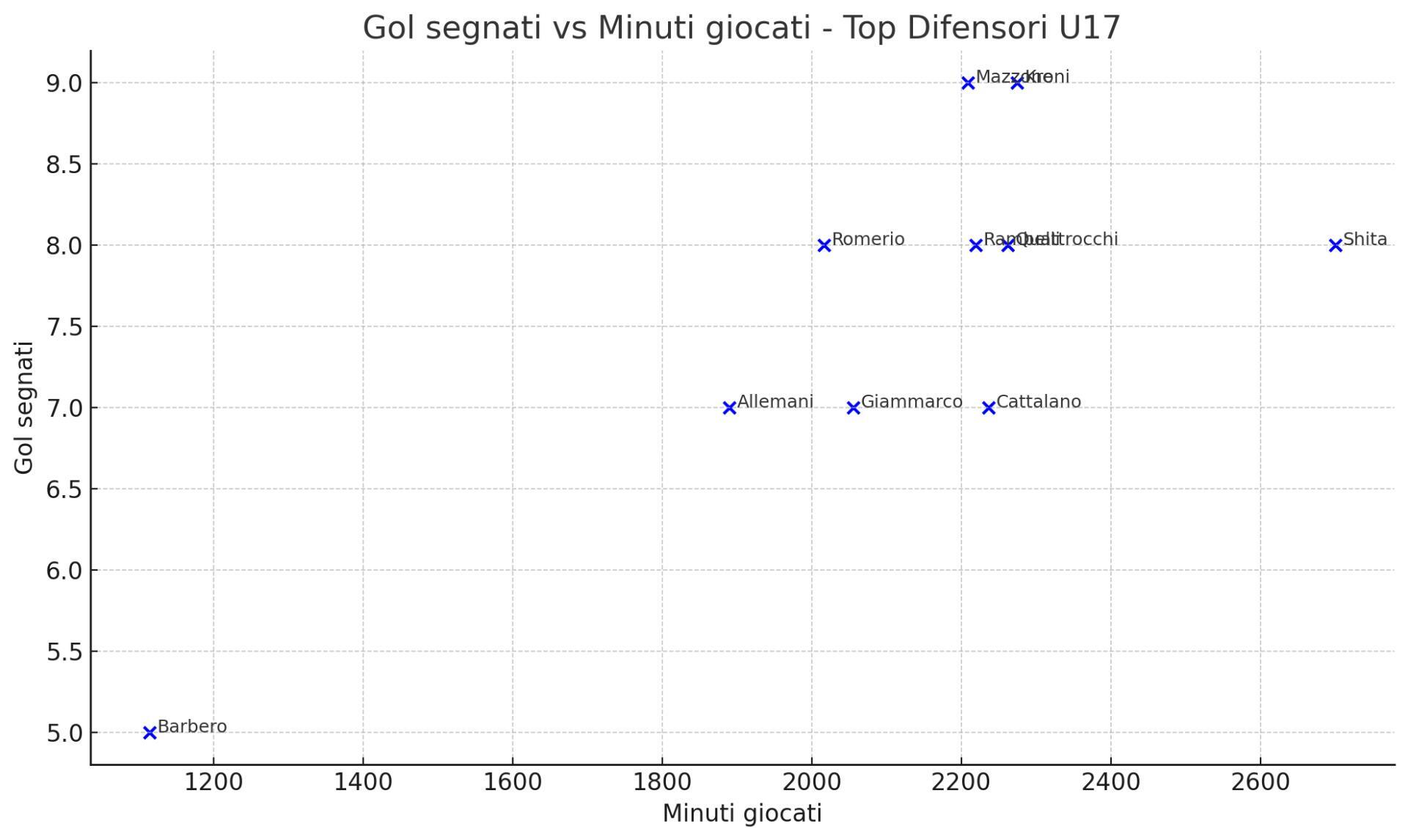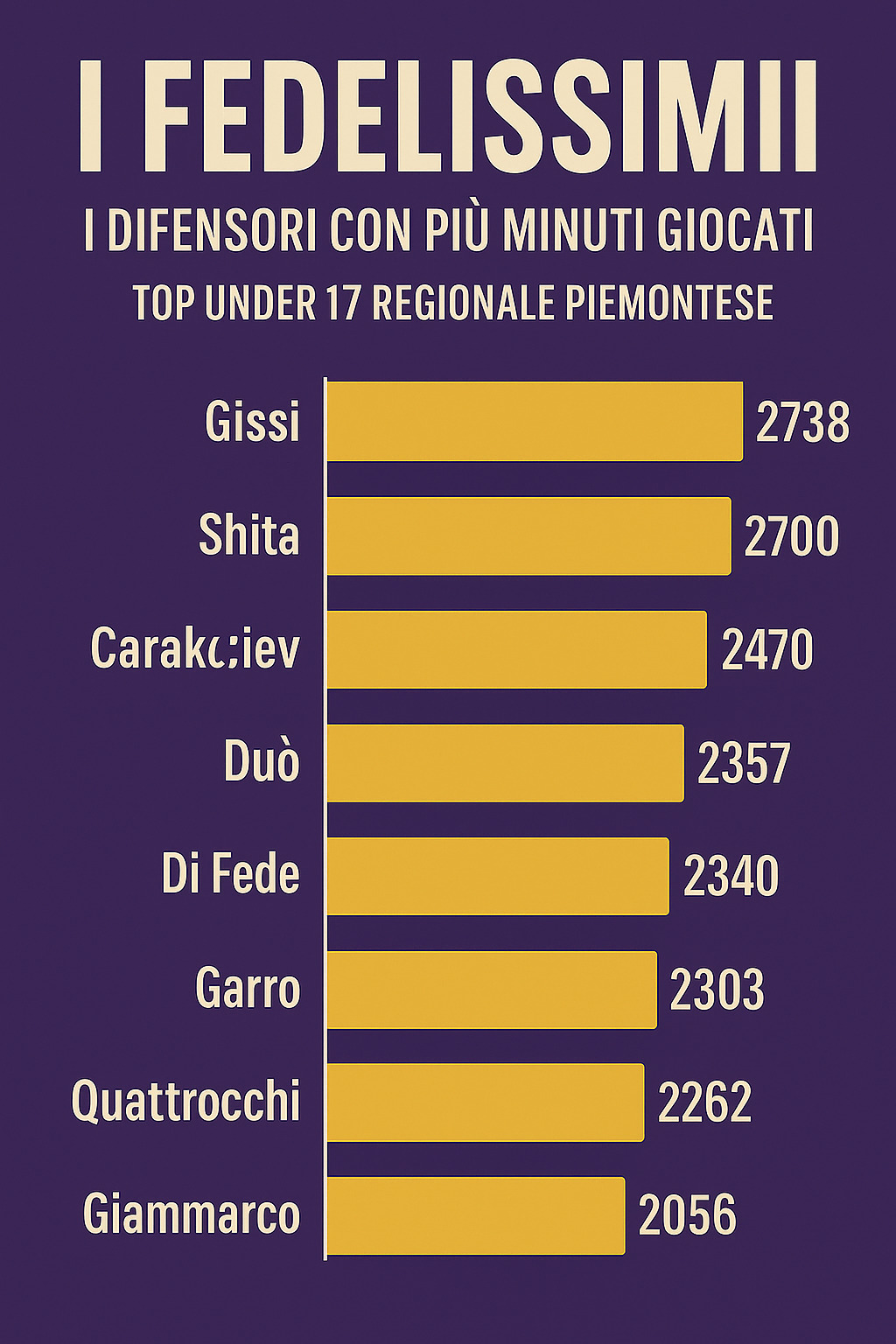 Partiamo da chi non è uscito mai dal campo, collezionando un tempo da record. Se il gol fa notizia, il minutaggio racconta una storia ancora più profonda: quella della fiducia guadagnata, della costanza, della leadership silenziosa. Alcuni dei difensori Under 17 sono stati sempre presenti, accumulando minutaggi che superano abbondantemente i 2200 minuti stagionali. Sono i pilastri a cui gli allenatori non hanno mai voluto rinunciare.
