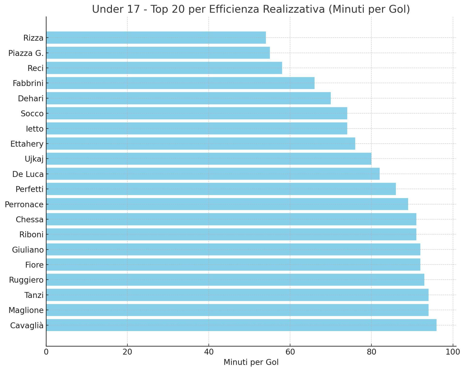 A guidare la classifica dell’efficienza offensiva troviamo Rizza del Lascaris: 28 gol in 1.515 minuti, una rete ogni 54 minuti. Un dato che impressiona non solo per la frequenza, ma anche per la costanza: Rizza gioca, incide e finalizza. È sempre nel vivo dell’azione e raramente lascia il campo senza aver lasciato il segno. Ecco perché Rizza non ha solo lasciato il segno in Under 17, l'attaccante bianconero, infatti ha già collezionato 4 presenze in Eccellenza di cui tre da titolare. È stato anche tra i protagonisti della spedizione in Sicilia al Torneo delle Regioni dove ha rimediato, durante il quarto di finale, un brutto infortunio che lo ha tenuto lontano dal campo fino ad ora, sta infatti tornando a giocare.