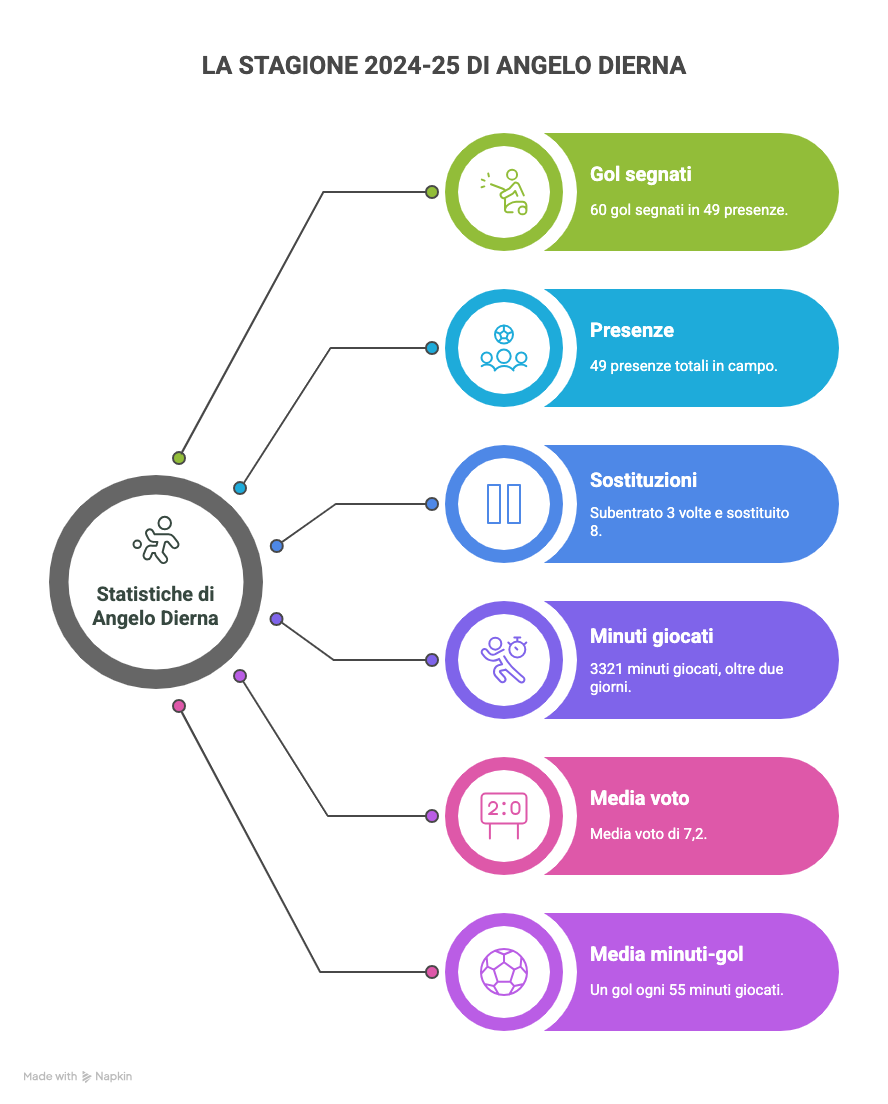 Ma ridurre la sua stagione ai soli numeri sarebbe riduttivo. Dierna ha brillato anche per personalità, maturità tattica e visione del gioco, elementi che si riflettono in una media voto stagionale di 7.58, tra le più alte nella categoria. Sempre schierato titolare, non è mai partito dalla panchina, e solo in una circostanza è stato sostituito a gara in corso: un dato che certifica quanto fosse centrale nello scacchiere della squadra.