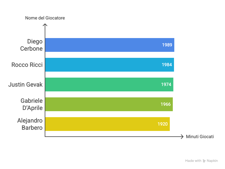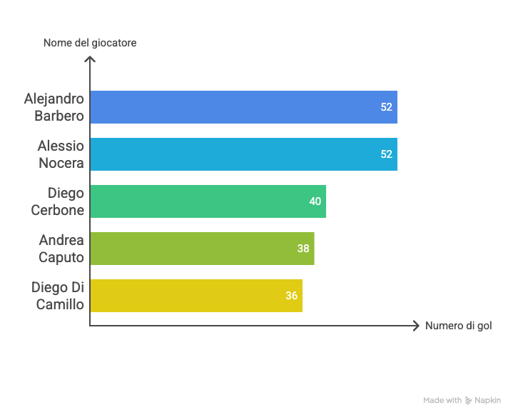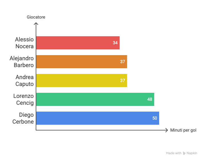 Infine, l’indice che racconta chi ha il miglior rapporto tra tempo in campo e gol segnati è forse il più intrigante: la media minuti/gol. In cima a questa classifica svetta ancora una volta Alessio Nocera, che segna un gol ogni 34 minuti, un dato semplicemente straordinario se pensiamo che equivale a due gol a partita. A seguirlo c’è il compagno di classifica cannonieri Alejandro Barbero, che realizza una rete ogni 37 minuti, dimostrando di non essere solo prolifico, ma anche incredibilmente efficiente, l'ex Toro ha fatto vedere magie.