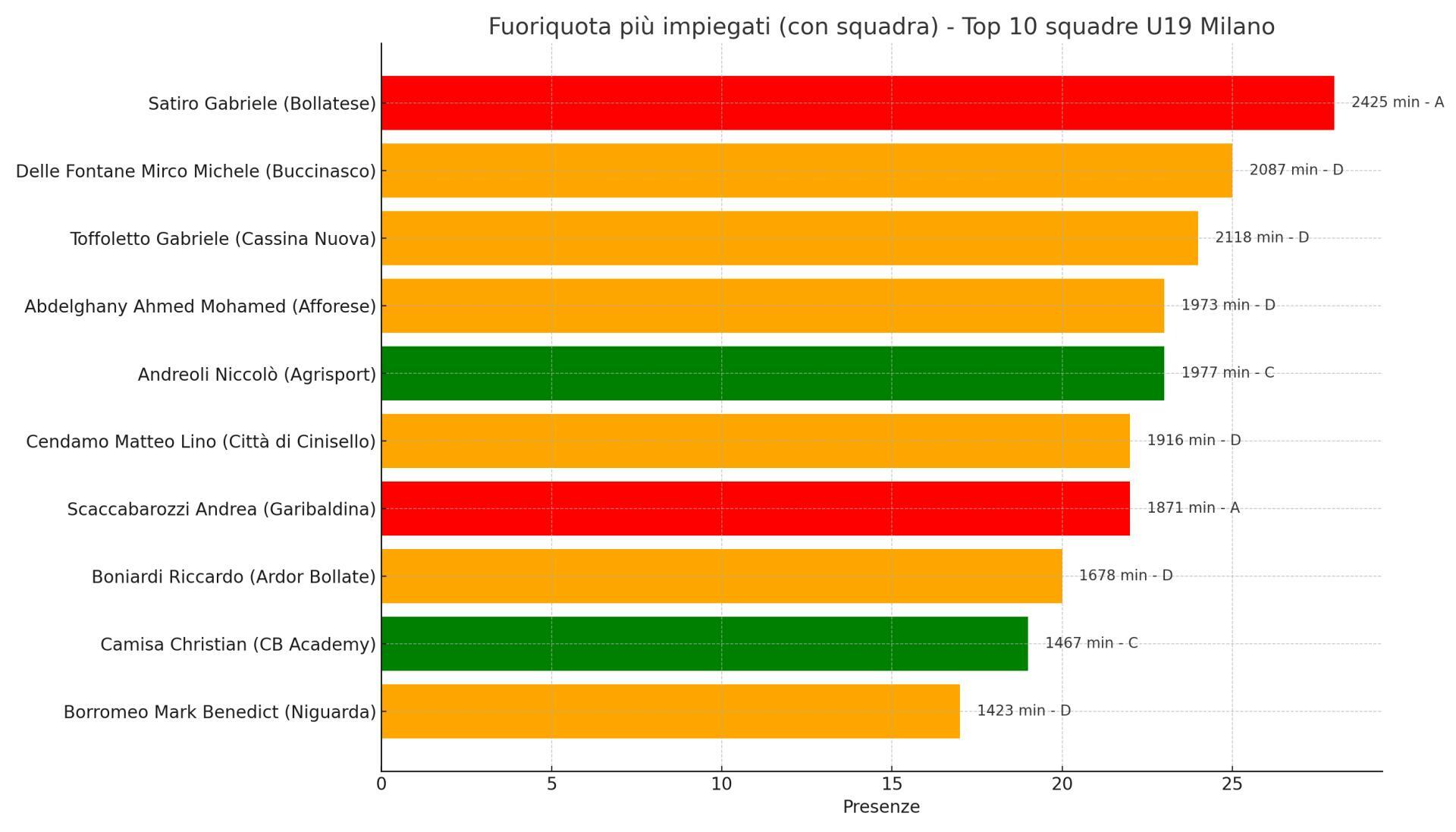 Guardando i numeri, una cosa è chiara: i fuoriquota dell’Under 19 milanese non sono semplici "riempitivi" di lista, ma veri protagonisti. Il grafico ci racconta storie di ragazzi che, pur essendo al limite d’età per la categoria, hanno saputo prendersi sulle spalle interi reparti. Spicca su tutti il nome di Gabriele Satiro, attaccante della Bollatese, che ha collezionato 28 presenze e 2.425 minuti: numeri da titolare inamovibile. Ma non è l’unico. Difensori come Gabriele Toffoletto (cassina Nuova) e Mirco Delle Fontane (Buccinasco) superano ampiamente i 2.000 minuti, dimostrando quanto sia fondamentale l’affidabilità degli over nel dare equilibrio e personalità a una squadra giovane.