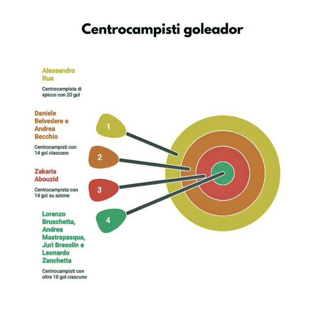 Centrocampisti goleador • Un capitolo a parte lo meritano i centrocampisti, protagonisti spesso silenziosi ma fondamentali. Alcuni di loro, infatti, hanno saputo incidere in modo significativo anche in zona gol. Su tutti emerge Alessandro Rua della Pro Eureka (che gioca da trequartista), autore di 20 gol in 29 presenze. Tre di queste reti sono arrivate su rigore, ma Rua ha anche dimostrato ottima qualità da piazzato. Da sottolineare anche la stagione di Daniele Belvedere (Bsr Grugliasco) e Andrea Becchio (Alpignano) con 14 gol ciascuno, Belvedere con 5 rigori, Becchio con uno. Impossibile non menzionare l’esterno Zakaria Abouzid del Vanchiglia, con 14 reti tutte su azione in 25 presenze. Infine a chiudere questa analisi, assolutamente da menzionare, altri 4 centrocampisti che hanno sfondato quota 10: Lorenzo Bruschetta (Suno) con 13 gol, Andrea Mastrapasqua (Pro Eureka) con 12 gol e Juri Bresolin (Mirafiori) e Leonardo Zanchetta (Accademia Casale) con 11.