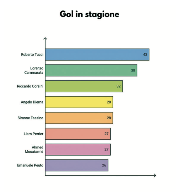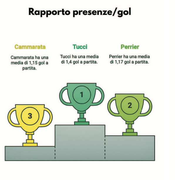 Rapporto presenze/gol • Guardando invece alla continuità e al rapporto tra presenze e gol, Tucci si conferma il miglior finalizzatore con una media superiore a 1,4 gol per partita. Un dato fuori scala, che nessun altro è riuscito ad avvicinare. Tra gli attaccanti più prolifici in rapporto alle presenze spiccano anche Perrier, con una media di 1,17 gol a gara, Cammarata (1,15), Corsini (1,10) e Mouatamid (1,08). Questi numeri dimostrano come, oltre al volume di reti complessive, la regolarità nel segnare sia stata un elemento distintivo.