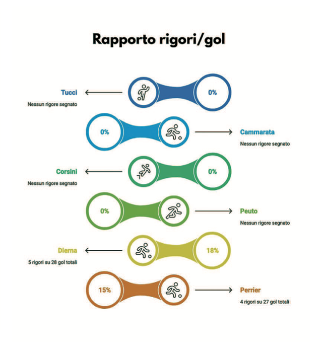 Incidenza dei rigori • Un aspetto interessante da valutare è il peso dei calci di rigore sul rendimento dei bomber. Alcuni di loro hanno tratto vantaggio da queste occasioni per incrementare il proprio bottino stagionale. È il caso, ad esempio, di Dierna, che ha segnato quasi il 18% dei suoi gol dal dischetto. Anche Perrier ha beneficiato di quattro rigori, che rappresentano circa il 15% delle sue reti totali. Al contrario, diversi bomber di vertice classifica non hanno segnato nemmeno un rigore, o ne hanno segnati molto pochi sul totale dei loro gol, è il caso di Tucci, Cammarata, Corsini e Peuto, che hanno costruito il loro intero bottino quasi esclusivamente su azione, mostrando una pericolosità costante durante tutto l’arco della stagione.
