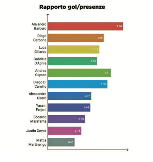 Presenze/gol • Guardando alla media tra gol segnati e partite giocate, il nome dominante è Alejandro Barbero, che viaggia a 1,68 gol a partita: devastante. A seguire, Diego Cerbone (1,25), Luca Gillardo (1,15) e Gabriele D’Aprile (1,10) mantengono medie altissime, tutti sopra quota 1. Anche Andrea Caputo e Diego Di Camillo (entrambi Lascaris e A.Borgomanero) si attestano su 1,41 e 1,33 rispettivamente. Più regolari ma comunque incisivi risultano Alessandro Girard, Yassin Ferjani, Edoardo Marafante e Justin Gevak, tutti con una media tra 0,75 e 0,97 gol a partita. Chiude il gruppo Mattia Martinengo, con 0,6 gol a gara, comunque prezioso per la continuità.