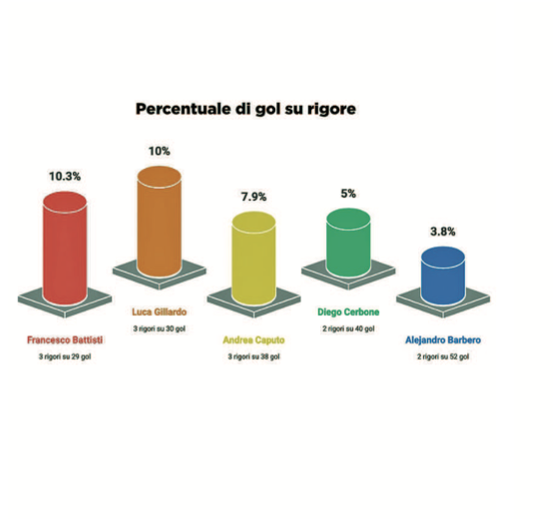 Il peso dei rigori • Segnare è importante, ma segnare senza rigori dà una panoramica ancora più precisa. Da questo punto di vista, il rendimento di Barbero, Cerbone e D’Aprile si distingue. Nel panorama dei bomber silenziosi ma estremamente efficaci, emerge Gabriele D’Aprile, anche lui della Volpiano Pianese. Ha realizzato 33 gol in 30 partite, con una media di 1,10, di cui solo uno su rigore. Tra i bomber selezionati, appunto, l’incidenza dei rigori è generalmente contenuta, segno che il grosso delle reti arriva da azione. Il giocatore con la percentuale più alta è Francesco Battisti (Morevilla), che ha realizzato 3 rigori su 29 gol, pari al 10,3%. Lo segue Luca Gillardo (Acqui), anche lui con 3 rigori su 30, ovvero il 10% esatto. Andrea Caputo (Lascaris) ha segnato 3 rigori su 38 gol (7,9%), mentre Diego Cerbone (Volpiano Pianese) si ferma al 5% (2 rigori su 40), e Alejandro Barbero (G.Centallo) ancora più in basso, con solo 2 rigori su 52 gol, pari al 3,8%.