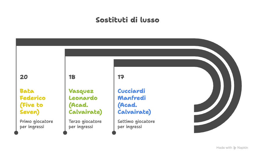 Scendendo in terza posizione, troviamo Leonardo Vasquez dell’Academy Calvairate, squadra che ha anch’essa centrato la vittoria del campionato nel girone di ferro conteso con FC Milanese e Sangiuliano CVS. L’attaccante è subentrato ben 18 volte, posizionandosi al terzo posto assoluto per numero di ingressi. Sempre dalla Calvairate arriva anche Manfredi Cucciardi, altro profilo di assoluto rilievo per continuità. Con 17 subentri, si inserisce nella top 10 dei più utilizzati dalla panchina. La sua frequenza d’impiego è un altro segno della profondità e solidità di una rosa vincente, quella di Fabio Falcone che al primo tentativo in via Vismara porta a casa l'ultima categoria Regionale mancante alla società.