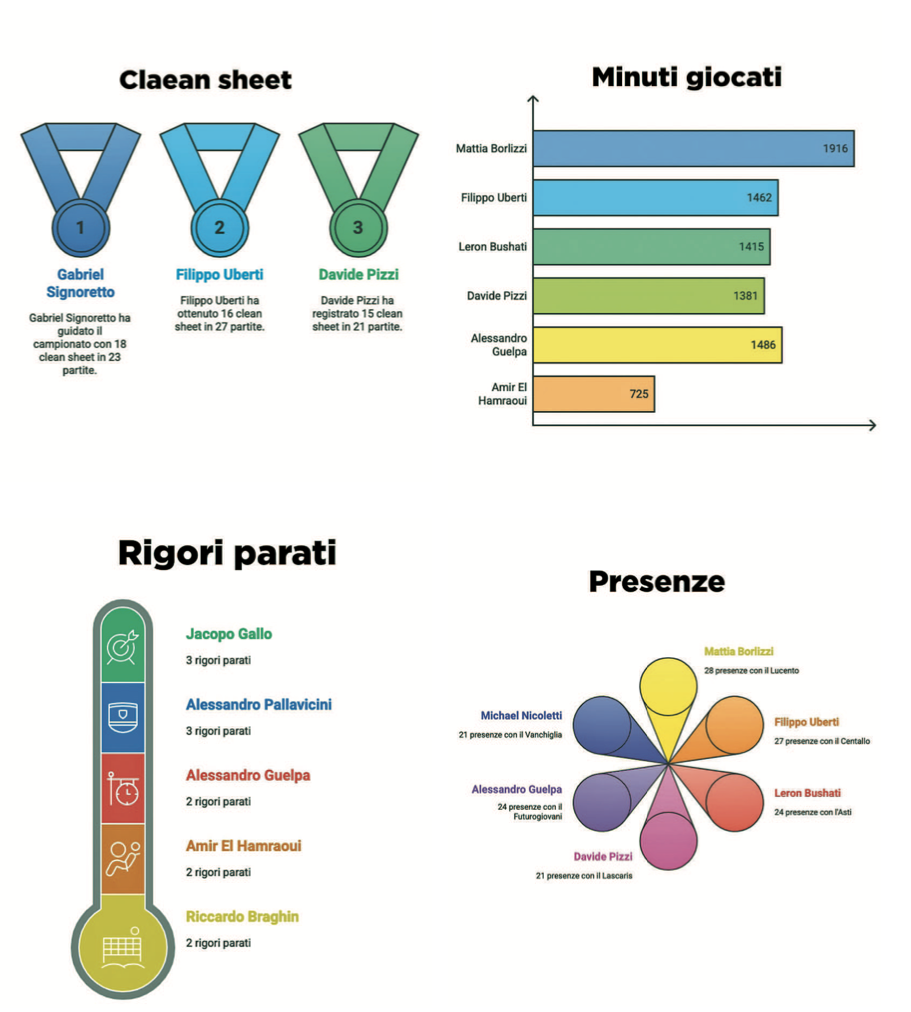 Reti inviolate, qui non si passa • Al vertice troviamo Gabriel Signoretto della Sisport, autore di 18 clean sheet in 23 presenze: un dato impressionante che certifica non solo la bravura individuale, ma anche il perfetto sincronismo tra portiere e reparto arretrato. Con una media di quasi un clean sheet ogni 1,3 partite, Signoretto ha messo il lucchetto alla porta con una sicurezza invidiabile. Praticamente per tutta la stagione Signoretto è stato a capo della graduatoria dei clean sheet e, anche guardando a tutto l’anno, non si smentisce. Anche un rigore parato per lui, nel 3-0 con l’Accademia Casale. Alle sue spalle si piazza Filippo Uberti, campione Regionale con il Centallo, che ha raccolto 16 clean sheet in 27 partite, dimostrando una costanza importante durante tutta la stagione. L’apice c’è stato in finale con la Volpiano Pianese quando ha tenuto in piedi i suoi con parate stratosferiche. Subito dopo, Davide Pizzi del Lascaris ha registrato 15 clean sheet su 21 presenze, con una media eccezionale (più di un clean sheet ogni 1,4 partite), che lo rende uno dei portieri più incisivi. Nei momenti di difficioltà lui, con grande padronanza del ruolo, ci ha messo i guantoni. Grande prestazione alla penultima di campionato con la Pro Eureka che ha regalato ai bianconeri la vittoria del girone. Poi Mattia Borlizzi del Lucento, con 14 clean sheet in 28 presenze, e Leron Bushati dell’Asti, con 12 clean sheet in 24 apparizioni, completano il quintetto d’élite dei portieri più ermetici del torneo.