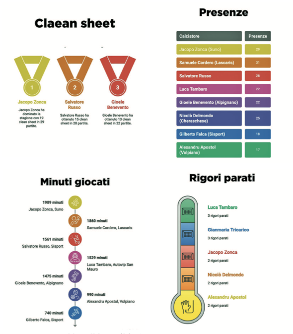 Clean sheet • In cima a questa speciale classifica troviamo Jacopo Zonca del Suno, autore di una stagione magistrale con 19 clean sheet su 29 presenze. Un dato che impressiona, soprattutto se rapportato ai 1989 minuti giocati, che fanno di lui uno dei portieri più presenti e affidabili della categoria. Grazie a tutti questi traguardi, è stato lui a vincere il Guanto d’Oro delle giovanili, tra tutte le categorie dell’SGS piemontese. Alle sue spalle, un altro nome importante è quello del campione Regionale Salvatore Russo della Sisport, con 15 clean sheet in 28 partite. Nonostante un minutaggio inferiore (1561 minuti), Russo ha saputo garantire sicurezza e solidità alla propria retroguardia. Meno minuti per Russo perché, così come nella stagione scorsa, si è alternato molto con Gilberto Falca, altro affidabilissimo portiere bianconero. Poco più sotto troviamo un trio a quota 13 clean sheet, ma con situazioni molto diverse: Gioele Benevento dell’Alpignano ha totalizzato questo risultato in 22 presenze e 1475 minuti, mostrando una media molto alta. A pari merito, Samuele Cordero del Lascaris (ora già al Torino) ha raggiunto lo stesso traguardo in 31 presenze e 1860 minuti, confermandosi titolarissimo per tutta la stagione. Benevento e Cordero, tra l’altro, sono stati i due portieri che han preso parte al Torneo delle Regioni in Sicilia. Completa il gruppo proprio Gilberto Falca (Sisport), che ha messo insieme 13 clean sheet in 18 presenze.