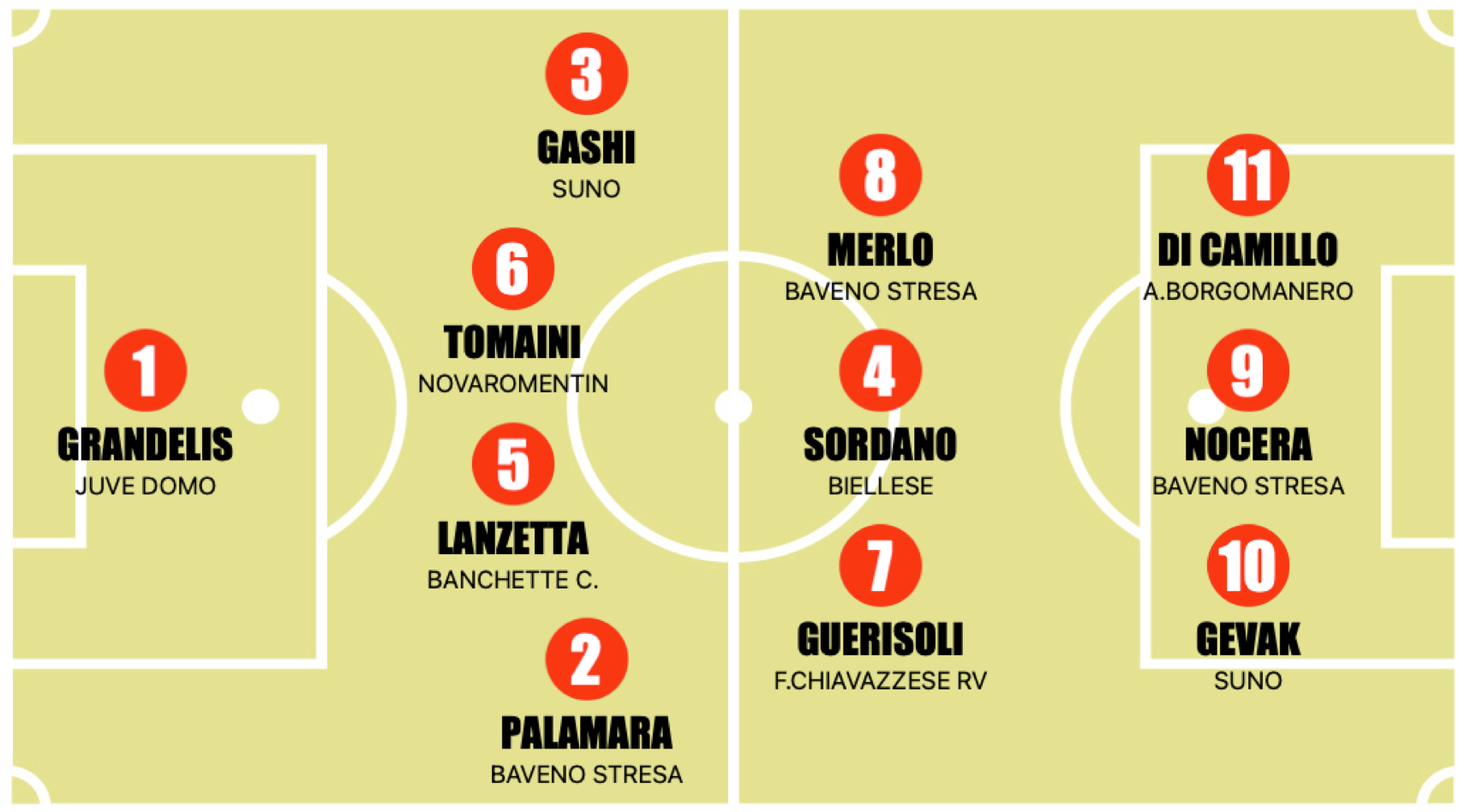 In mezzo partiamo subito da Guerisoli della Chiavazzese, che è stato arretrato in questa speciale top perché per numeri, rendimento e personalità non poteva non avere uno degli 11 posti. Al suo fianco Merlo, anche lui del Baveno anzi ex Baveno visto che ha già firmato con il Novara. Centrocampista completo con passo, visione di gioco, qualità da incursore, tanto da meritarsi anche un ruolo in Rapp Under 14. Infine, Sordno della Biellese: 18 gol in stagione, è il centrocampista che ha segnato di più in tutta la stagione.