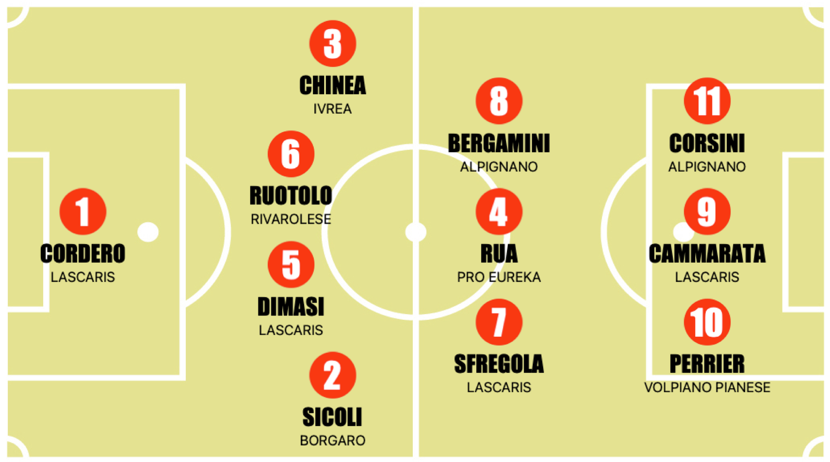 L'ultimo protagonista di questa super squadra è Liam Perrier, attaccante della Volpiano Pianese che dopo un avvio di stagione non da lui si è ripreso la squadra sulle spalle tornando a fare la differenza in tutte le partite. Chiude il conto dei gol a 27 in 20 presenze nel girone, ma con ulteriori 11 reti in partite ufficiali nei playoff e nelle altre competizioni la cifra dei gol stagionali sale a quota 38. A differenza dei primi due, però, in campionato il minutaggio di Perrier è stato decisamente inferiore con 400/500 minuti in meno disputati rispetto a Corsini e Cammarata. Nella statistica della media gol per minuti giocati, infatti, il bomber delle Foxes è secondo dietro a Sfregola con 1 rete ogni 37 minuti.