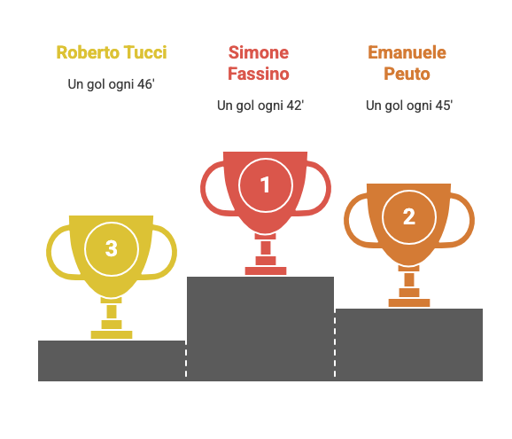 A guidare la classifica c’è Simone Fassino, attaccante del Chisola, con una media da capogiro: 28 gol (di cui uno su rigore) in appena 1173 minuti, con una frequenza di una rete ogni 42 minuti. Nonostante le sole 27 presenze, Fassino ha avuto un impatto devastante ogni volta che è sceso in campo, mantenendo anche una media voto altissima: 7,43. La sua efficacia realizzativa è il frutto di una combinazione letale tra senso del gol, tempismo e anche una grande intelligenza tattica. Seconda piazza per un altro centravanti micidiale: Emanuele Peuto. Le sue 26 reti in 1179 minuti, distribuite su 31 presenze, parlano da sole. Il numero impressionante è la sua media di un gol ogni 45 minuti, praticamente uno a partita anche quando non gioca tutti i 70 minuti regolamentari. La media voto di 7,29 rafforza l’idea di un giocatore costante, determinante e affidabile. Autentico mattatore stagionale, Roberto Tucci è l’unico a superare i 40 gol in stagione: ben 43, di cui uno dal dischetto. È il miglior marcatore dell'Under 15 e non poteva che rientrare anche in questa statistica. Il suo minutaggio totale (1989) è comunque piuttosto elevato, il che rende la sua media di un gol ogni 46 minuti ancora più significativa. Con 29 presenze Tucci è stato l’uomo simbolo della sua squadra. Con 38 gol in 1886 minuti e 33 presenze all’attivo, Lorenzo Cammarata è una macchina da gol. Il suo dato di un centro ogni 50 minuti lo colloca tra i giocatori più dominanti della categoria. Non solo con il Lascaris ma anche con la Rapp Piemonte Vda (con cui è stato un simbolo anche in Sicilia) e la Rapp LND. Cammarata intanto ha già firmato per il Bra per la futura Under 16 Serie C. Futuro compagno di Cammarata al Bra, Riccardo Corsini, ormai ex Alpignano, è la conferma che il gol non è solo una questione di presenze: con 29 apparizioni, ha messo a segno 32 reti, distribuite in 1808 minuti. La media è di un gol ogni 56 minuti senza rigori.