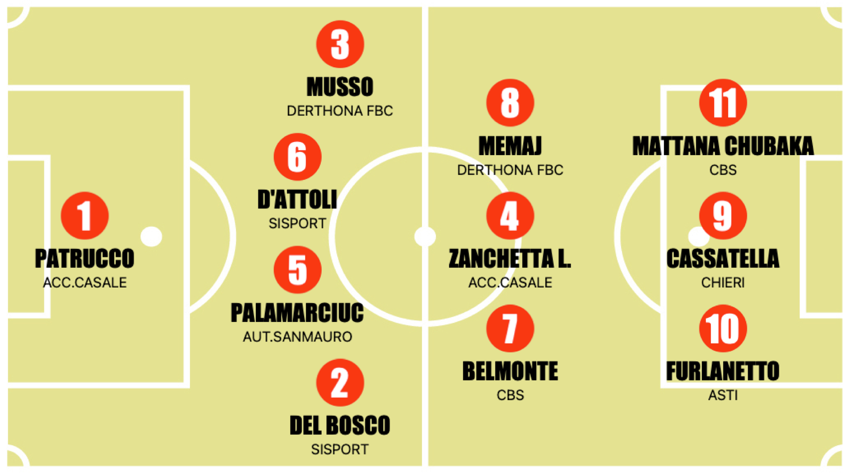 Al centro dell’attacco troviamo invece Vittorio Cassatella del Chieri, autore di 12 reti in 26 presenze che hanno contribuito a portare, per la seconda stagione consecutiva, la formazione di Pierluigi Ciletta ai playoff. Proprio le fasi finali sono state un gran terreno di caccia dal punto di vista realizzativo per il bomber biancazzurro, capace di segnare tre reti in quattro partite e di trascinare il Chieri fino ai quarti di finale.