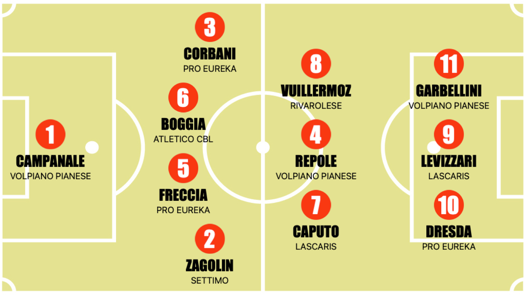 Sicuramente Giacomo Vuillermoz della Rivarolese. Una Rivarolese in grado di imprese, che ha chiuso quarta in stagione puntando fino all'ultimo ad un posto nei playoff. 1556 minuti in 25 presenze. Perno della difesa non può che essere Riccardo Repole del Volpiano. Capace di impostare, di segnare, di difendere. Uno dei protagonisti della cavalcata della Foxes. Poi, prima dell'ultimo slot è doverosa una premessa: il suo ruolo non è la mezzala, è un esterno, ma era impossibile non mettere in questa top Andrea Caputo del Lascaris. Capitano, leadre, autore di gol pesantissimi. Grandissima stagione per l'esterno bianconero.