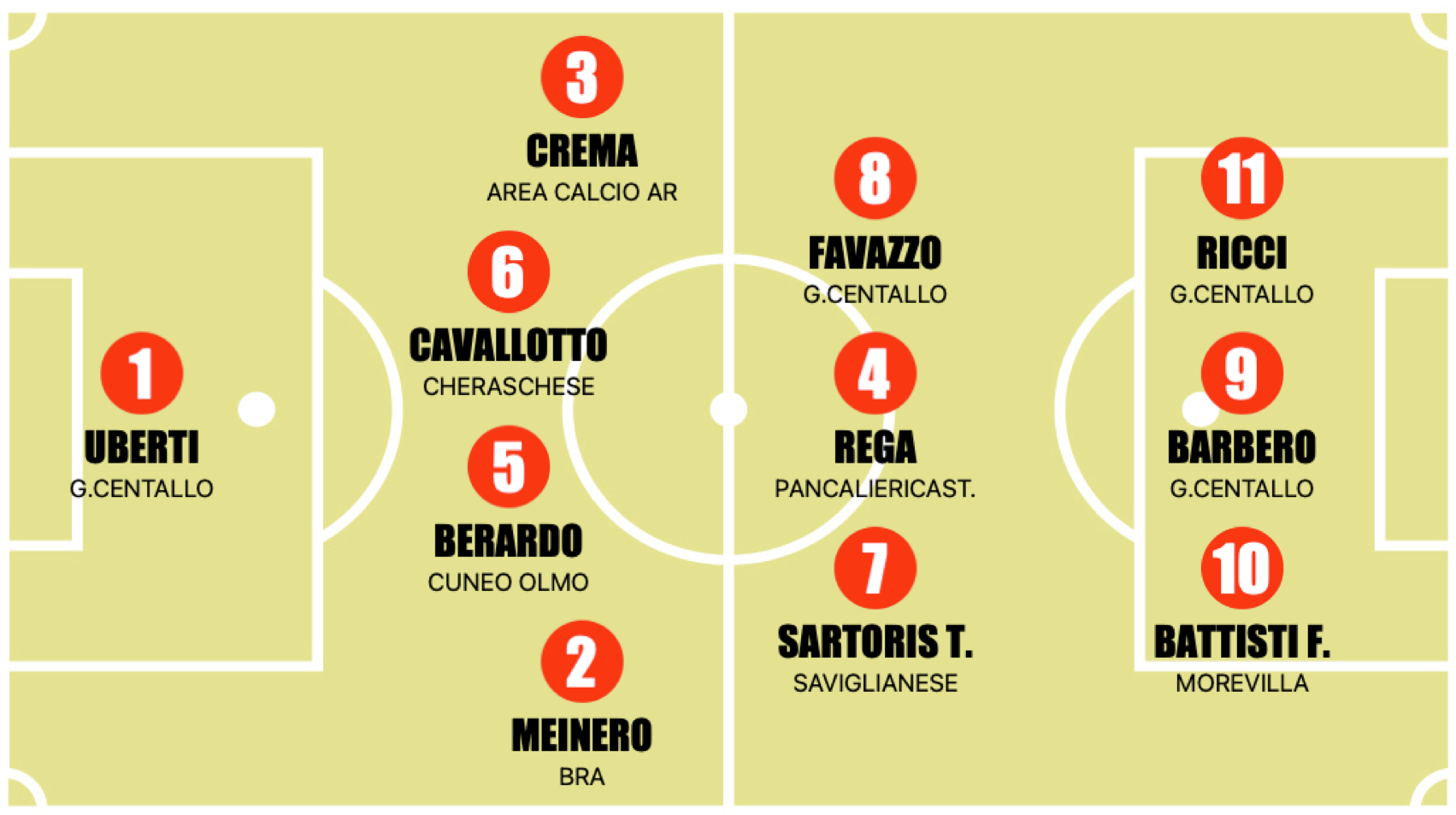 In mezzo al campo partiamo subito dal play: Lorenzo Rega. È vero che il Pancalieri non ha avuto una stagione facile, ma Rega è sempre stato tra i trascinatori del gruppo, l'ultimo ad alzare bandiera bianca. Per lui 25 presenze e 1471 minuti conditi da 10 gol (ora Rega ha firmato per il Carmagnola). Poi da menzionare anche la stagione di Tommaso Sartoris della Saviglianese. Giocatore completo capace di inserirsi e segnare (11 gol e 3 rigori). Affianco a lui uno dei centrocampisti migliori tra i classe 2011: Thomas Favazzo. Campione Regionale con il Centallo, passo, visione di gioco, abilità palla al piede, capace di difendere ma anche di segnare (come dimostra il suo gol in finale Regionale, gol del 2-1 tra l'altro). L'ex Toro ora riconfermatissimo a Centallo ha brillato, tanto da attirare l'attenzione anche di Gian Luca Chessa che ne ha fatto uno dei perni della Rapp Under 14, fino al Torneo Cairo Montenotte dove Favazzo ha anche vinto il premio miglior calciatore dilettante.
