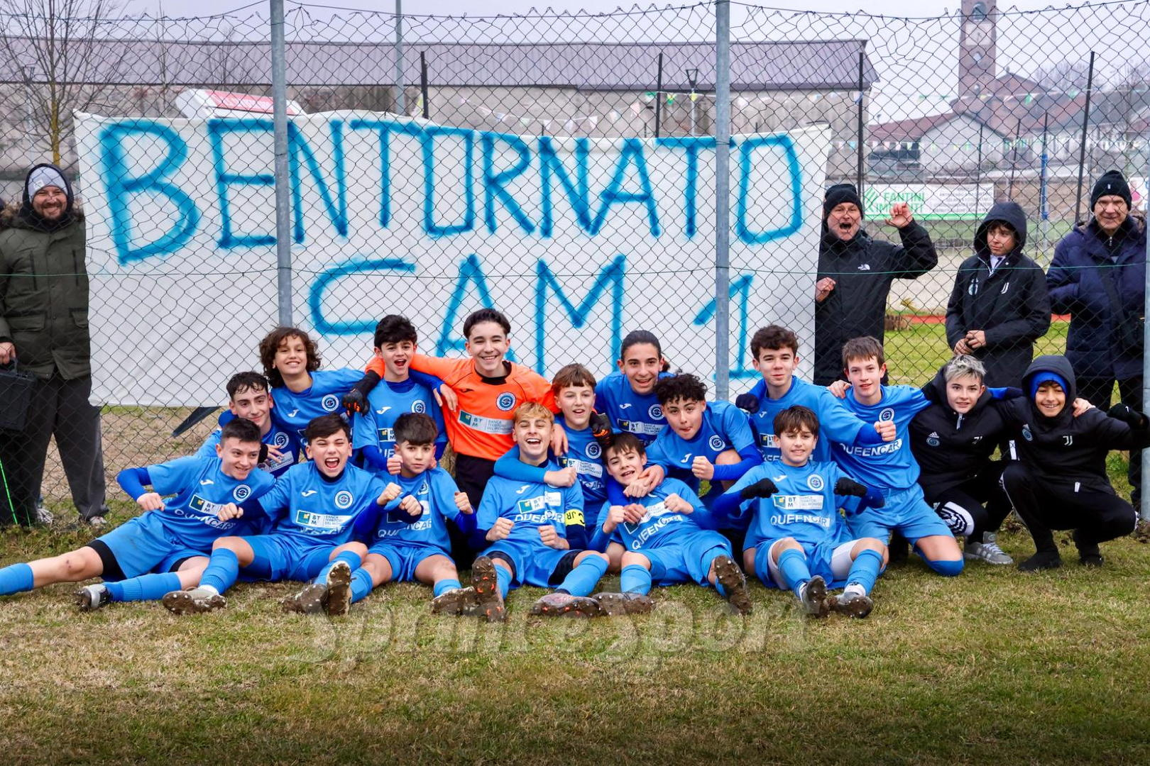 Il calcio è fatto di sogni, di speranze, di racconti, di emozioni, forti come quelle di un gol che sblocca la partita, uniche e intense come l'abbraccio della squadra a un compagno che torna a giocare dopo aver passato 4 mesi lontano dai campi di gioco, tantissime sono quelle accompagnano la capolista Carmagnola nell'ultima di campionato dell'anno solare, il 2025, salutato con l'esultanza finale tutti insieme sotto lo striscione. Si festeggia il primo posto, l'ottava vittoria in 9 giornate, la doppietta del capitano Daniel Marino che raggiunge quota 20 in testa alla classifica dei cannonieri, e sullo sfondo l'abbraccio, fisico e virtuale, da parte di tutta la squadra, dei tifosi e della società, a Simone Samson, il portiere 2012 tornato in campo dopo 110 giorni di assenza, per riprendersi dall' "infortunio" rimediato in quella sera di settembre al Super Oscar a Collegno. Uno striscione grandissimo dedicato a lui, l'appaluso di bentornato dei compagni che lo aspettavano a centrocampo prima del fischio d'inizio, la corsa di Simone verso di loro. Poi testa alla partita, perché il Pancalieri è avversario di tutto rispetto e lo ha subito dimostrato.