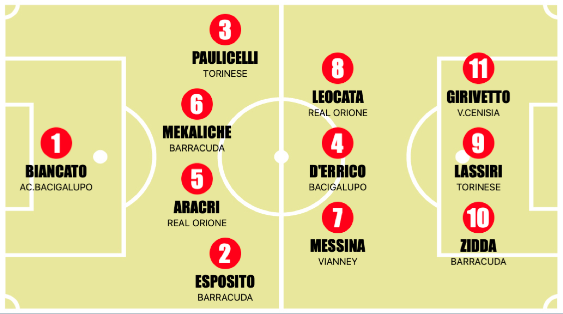 Davanti c'è una squadra che guarda tutti dall'alto e continua a dettare il ritmo del campionato, imponendo, gioco, risultati e personalità. Ma alle sue spalle nessuno si rassegna: la squadra inseguitrice resta incollata, accorcia le distanze, respira sul collo della capolista e manda un messaggio chiaro: la corsa non è affatto chiusa. Il Girone A sembra ormai conteso tra Barracuda e Virtus Cenisia, due squadre ancora imbattute che si daranno battaglia nella prima giornata della seconda parte della stagione. Al terzo posto abbiamo il Vianney che nell'ultima partita, grazie alla vittoria sul Borgo Vittoria e alla sconfitta dell'Academy Bacigalupo, riesce ad agganciare il terzo posto e la zona Play Off. Subito a seguire abbiamo propio i nerazzurri, la Torinese e il Real Orione, rispettivamente ferme a 26, 24 e 22 punti. Insomma, le sorti del girone non sembrano del tutto decisi, appuntamento a Gennaio per continuare a seguire le altre battaglie, ma intanto ecco la Top 11 delle prime 13 giornate di campionato.