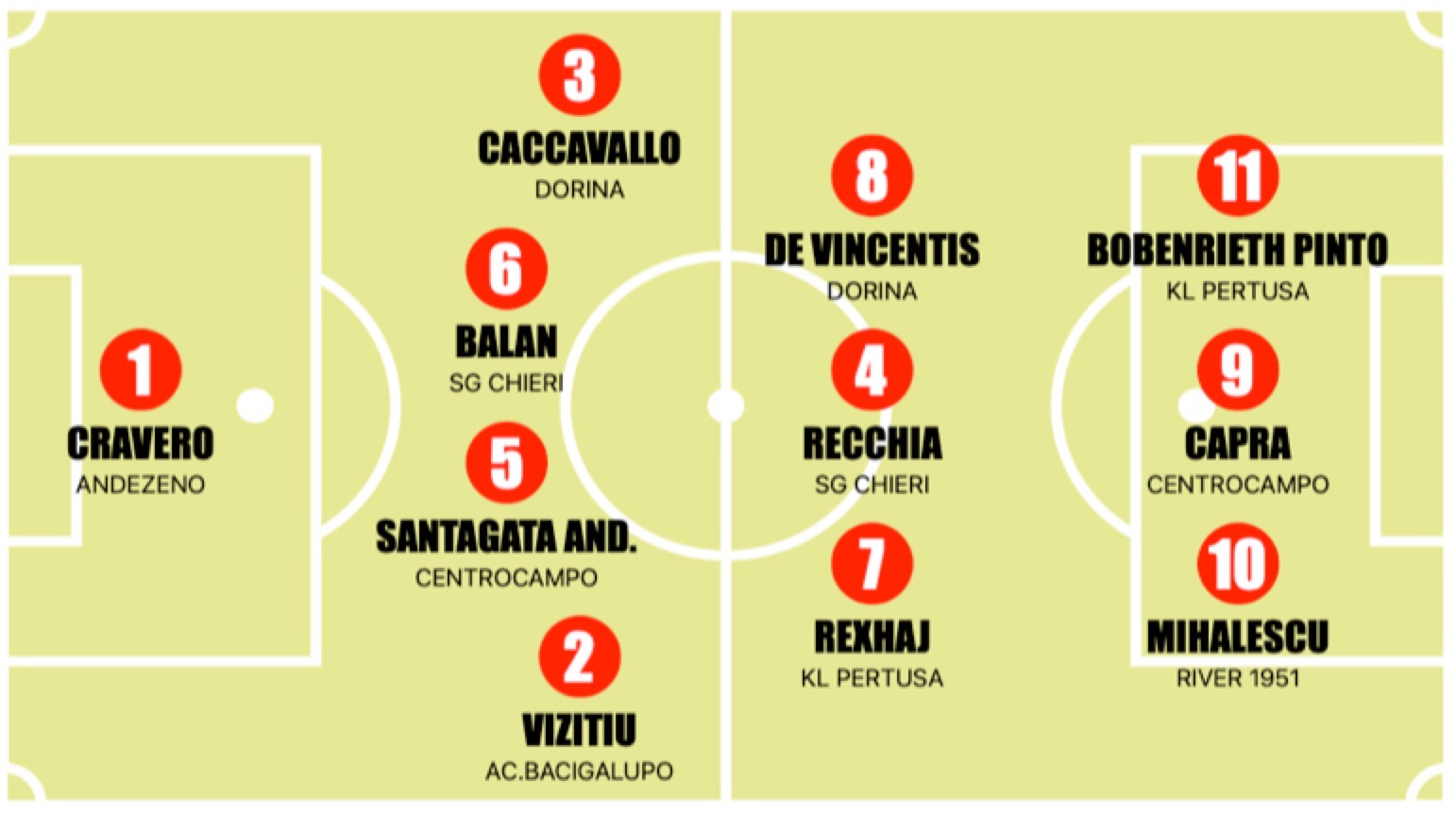 A un mese esatto dall’ultima giornata disputata, è tempo di fare il bilancio di questa prima parte di stagione. Undici partite giocate e una capolista incontrastata, il Dorina di Francesco Fabiano, ancora imbattuto e forte di 9 vittorie e due pareggi. Le inseguitrici, però, rimangono agguerrite e pronte a cogliere ogni opportunità, con il San Giacomo che segue a 4 lunghezze di distanza e con il Pertusa a 5. Tutto ancora apertissimo, dunque, nel frattempo vediamo chi sono i migliori undici di questa prima parte di stagione.