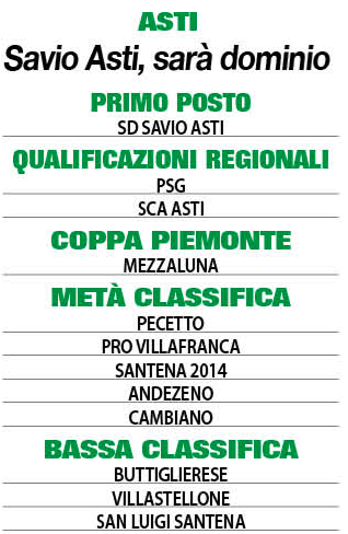 Sembra tutto già scritto nell’astigiano con il Savio Asti che, fin qui, non sembra avere rivali. I gialloverdi sono i favoriti numero uno per il titolo, ma occhio anche alla possibilità di chiudere da imbattuti il campionato. Sca Asti e PSG partono avvantaggiate per conquistarsi un posto alle qualificazioni regionali, con la squadra di Russo che ha tutte le carte in regola per rimontare i bianconeri. Attenzione a Mezzaluna e Pecetto che si contenderanno fino all’ultimo un posto in Coppa Piemonte, ma la zona regionale è ad un passo e sognare non costa nulla. Il gruppo a metà classifica composta da Andezeno, Cambiano, Santena 2014 e Pro Villafranca sembra esser fuori dalla lotta, ma i ragazzi di Iannarella non sono da sottovalutare. Chiudono Buttiglierese, Villastellone e San Luigi Santena, con i gialloviola che vorranno trovare la prima gioia.