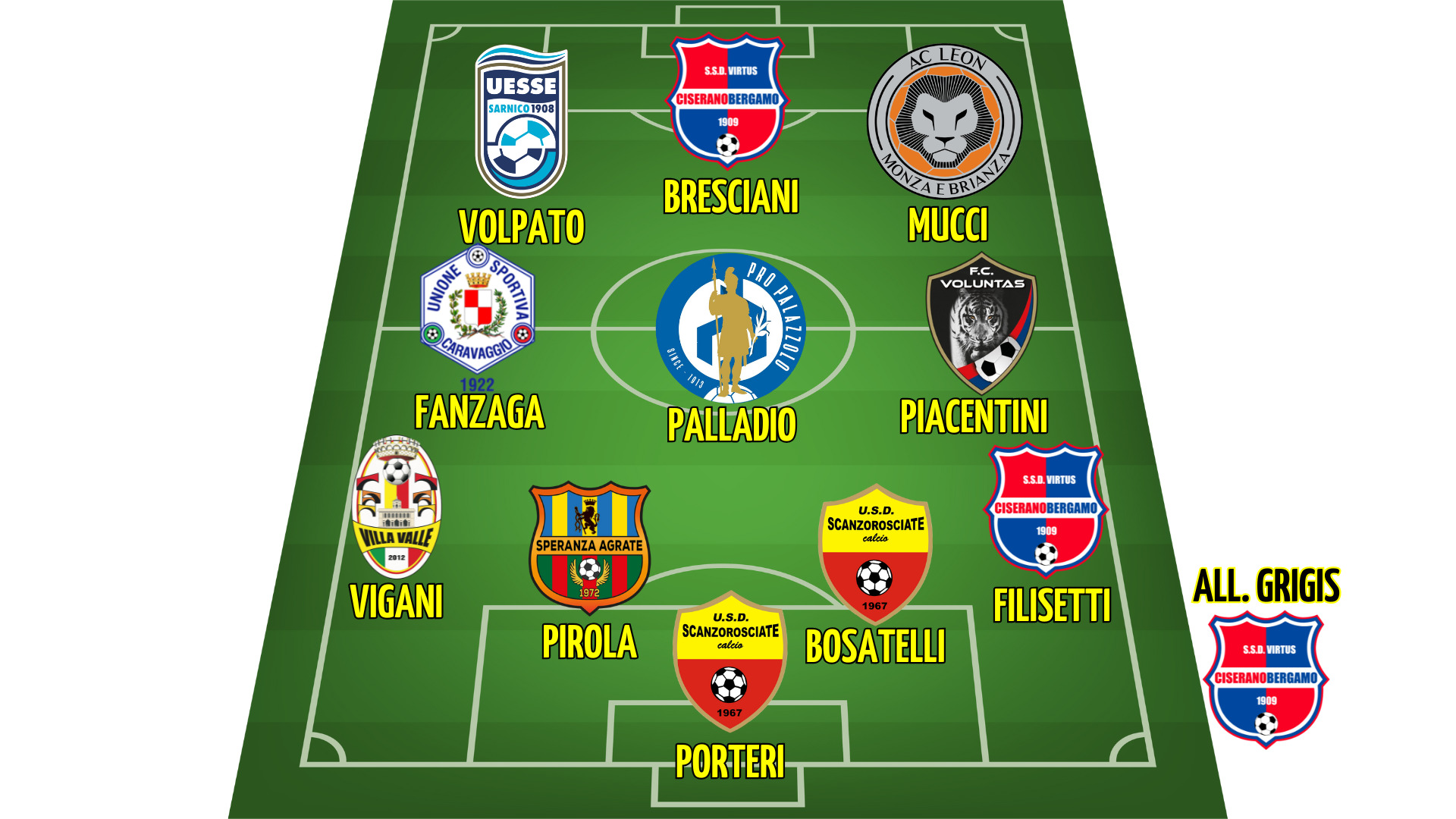 Per comporre una squadra eroica senza precedenti, viene d’obbligo disporla sul modulo classico e più offensivo della vecchia guardia, esaltando tutte le qualità dei singoli già impegnati su questo spartito con i rispettivi club: il 4-3-3. A difendere i pali dello schieramento stellare, non ci può che non essere Alessio Porteri, saracinesca dello Scanzorosciate. Sui lati, due sicurezze e due bandiere delle due rispettive regine bergamasche. Sulla destra la bandiera della Virtus Ciserano, Marco Filisetti mentre a destra, la corsia è impegnata dalle falcate di Mattia Vigani, uno dei punti di riferimento del Villa Valle. A comporre la coppia difensiva invalicabile, spazio sul centro destra ad Alberto Bosatelli, pilastro dello Scanzo e centrale fastidioso al tatto degli attaccanti, baricentro alto per spezzare le trame avversarie. Al suo fianco Matteo Pirola, il tuttofare di Agrate a comporre una compattissima linea difensiva, con i suoi guizzi offensivi e verticali da vero centrale moderno. In mediana a dirigere gli schemi del dream team, non può mancare Andrea Palladio, roccia, illusionista e geometra della Pro Palazzolo, nonché capitano e punto di riferimento dentro e fuori dal campo. Sul centro destra arriva lui, il metronomo del centrocampo di Urbani, Matteo Piacentini, per concludere il reparto con il fantasista di Ortori: Leonardo Fanzaga. In avanti spazio ai tre tenori del girone, dove caschi, caschi in piedi. In qualsiasi zona dell’attacco un pallone addomesticato da quei tre, sicuramente i pericoli sono avvisati. Da destra verso sinistra, ecco lo sposta equilibri della Leon di Luca Corti: il mago di Biassono Jacopo Mucci. Sulla sinistra il bomber del girone attenzionato già da molti, Lorenzo Volpato gioiellino del Sarnico a quota 13 gol in 14 presenze. Prima di terminare con il diamante capocannoniere del girone e della capolista irreprensibile, Giacomo Bresciani con più reti siglate che presenze da titolare.