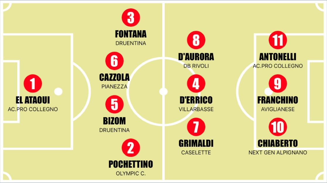 In questa giornata brilla la Druentina di Gianluca Gioda, che batte per 4-1 l’Atletico CBL grazie ad un secondo tempo perfetto: ad aprire le danze è il gol di testa del capitano Denis Bizom, salito in area per raccogliere la punizione di Samuele Favale, poi raddoppia un altro difensore, Mattia Fontana, che spacca la porta di Burel con un mancino preciso, rendono il risultato più tondo Antonio De Feo e Tommaso Triolo, che mettono il punto esclamativo su un match giocato ad alti livelli dai rossoblù, che agganciano la squadra di Fornasieri in classifica e si mettono al terzo posto. Vince anche il Caselette che, sfruttando il riposo della capolista Paradiso, va a -2 dal primo posto, per i neroverdi la partita si complica non poco, dopo il doppio vantaggio immediato degli ospiti, l’Olympic Collegno rimette l’incontro in parità già nel primo tempo, nella ripresa risolve però la pratica Alessandro Grimaldi, che permette ai suoi di vincere un match pesantissimo e che mette un po’ di pressione ai gialloblù di Amore. Subito dietro Druentina e Atletico ci sono la Next Gen Alpignano, che si impone 7-0 in casa dell'Almese, e il Pianezza che supera per 1-0 il Fiano grazie al gol partita di Mattia Cazzola. Show finale a Rivoli, dove Samuele Arnolfo para un calcio di rigore a 8 dalla fine e tiene i suoi in gara, Paride D’Errico riesce poi a trovare il gol del pareggio al secondo minuto di recupero, recuperando la rete di Alessandro Lanza Caivano, segnata nel primo tempo.