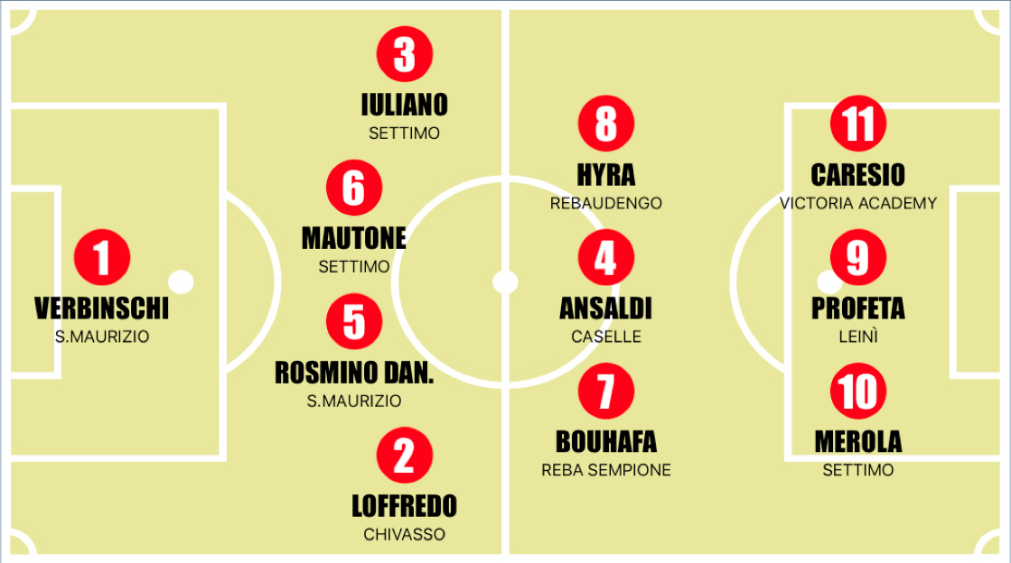 Il Settimo vince uno scontro diretto importantissimo grazie al proprio miglior giocatore della stagione, Simone Merola, numero 10 che, dopo aver già deciso il big match a Mappano con una doppietta, fa sognare i propri tifosi con una rete sensazionale da 30 metri nell’ultimo minuto di gioco in casa del San Maurizio. Con questo gol da urlo, il Settimo continua la propria corsa a due con il Rebaudengo, con entrambe le squadre che restano a punteggio pieno dopo nove giornate, la squadra di Massimo Santarossa vince in casa della SkillStar 4-1, ma perde il proprio primato di 0 gol subiti (unica squadra in tutto il Piemonte a questo punto dell’anno) andando addirittura in svantaggio dopo la rete di Enrico Impiccichè. Anche a Chivasso l’incontro si scalda nel finale, la Victoria Academy agguanta una vittoria insperata grazie ad una rimonta nei minuti finali, al 34’ Lorenzo Caresio pareggia il vantaggio di Gabriele Perrotta, mentre nel primo minuto di recupero Simone Finistrella porta in vantaggio i suoi; tre punti fondamentali in chiave play-off vista la sconfitta del San Maurizio, ora la squadra di Daniele Giardini è al terzo posto con la Mappanese, a -5 dalla prime due. Ennesimo show di Daniel Caiazzo, contro il River realizza la sua terza tripletta stagionale in nove presenze, senza contare il poker alla Torinese. Vincono anche Mappanese e Leinì, con un Matteo Profeta in super forma, pareggiano 3-3 Reba Sempione e Barcanova.