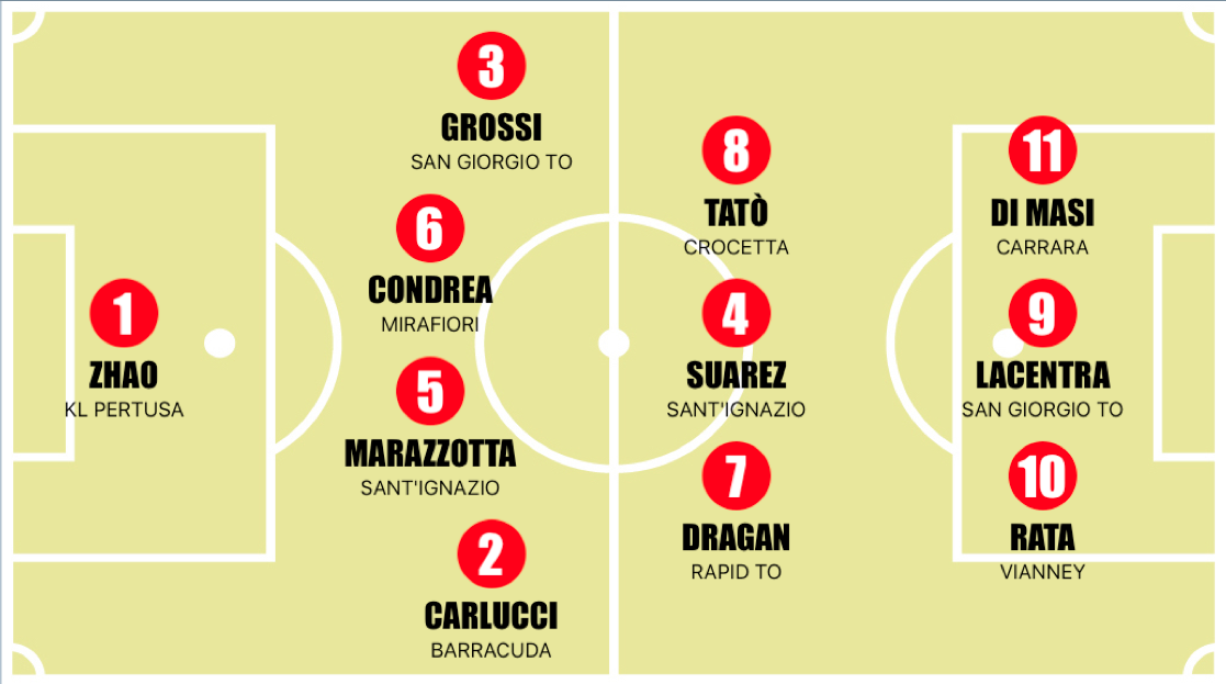 Sono bastati 16 minuti a Diego Lacentra per farsi conoscere dal suo nuovo pubblico, sempre di colore viola, l’attaccante del San Giorgio arrivato dal Cenisia timbra il suo esordio con la doppietta nel big match con il Crocetta, avversario sempre insidioso e che recrimina per alcune decisioni arbitrali dubbie, la capolista vince anche questa e resta due punti avanti al Sant’Ignazio nella sfida a distanza tra le uniche due squadre imbattute del Girone. Vince senza problemi anche il Mirafiori che segue al terzo posto, importante vittoria per Barracuda che con la doppietta di Gabriele Carlucci batte e aggancia il Carrara (rinforzato dal mercato invernale) in quinta posizione, mentre al quarto posto resiste la Virtus Cenisia vincente 2-0 (Mattia Crocco e Gabriele Perrone) con l’Academy Bacigalupo. Primo punto per il Beppe Viola che avrebbe forse meritato anche qualcosa in più nella sfida con il KL Pertusa che adesso ha in Bruno Ferrari (in sostituzione di Antonio Ciccia) il suo nuovo tecnico, cambia anche il direttore sportivo in via Genova, con l’arrivo di Ciro Sfarra. Ritrova la vittoria il Vianney che, dopo 3 sconfitte consecutive, batte in trasferta il Rapid.