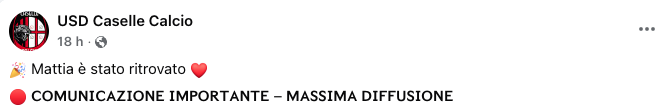 I POST CON LA BELLA NOTIZIA DEL RITROVAMENTO DI MATTIA SUI SOCIAL DEL CASELLE CALCIO
