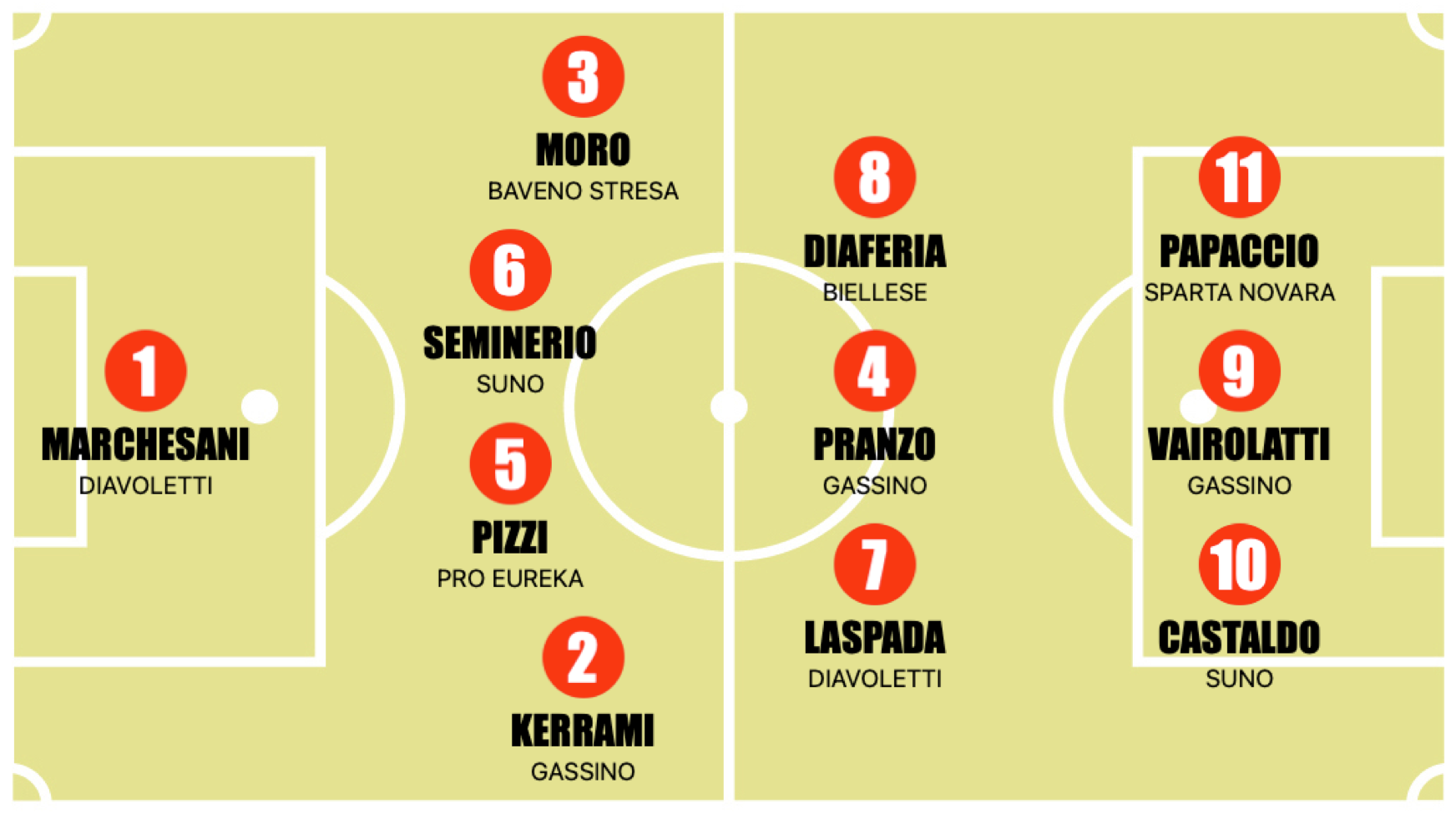 Continua la corsa inarrestabile del Suno che non ha problemi in casa con l’Autovip San Mauro: 7-1 con doppietta di Matteo Castaldo e poi cinque marcatori diversi per una gara mai in discussione e che conferma i lupi a punteggio pieno. Non sbaglia però neanche l’inseguitrice più diretta, la Biellese, che rimane a due punti di distanza dal primato in virtù di un altro 7-1, in questo caso inflitto alla NovaRomentin. Si mette in mostra Alessandro Maffei con la sua tripletta a cavallo tra le due frazioni di gara. Vincono poi anche tutte le squadre dalla terza alla sesta in classifica: Lorenzo Aceto ed Emanuele Genco ne fanno due a testa nel 4-1 della Pro Eureka sul Città di Cossato; pokerissimo dei Diavoletti sul Verbania con tanto di tripletta per Andrea Laspada; quattro reti anche per il Baveno Stresa che supera l’Union Novara e si gode un doppio Alex Guerra. Più sofferta e per questo ancora più bella invece la vittoria della Sparta Novara sul Gozzano, un 3-2 maturato nel finale dopo essere stata due volte in svantaggio. Decisivo Alessandro Papaccio che la pareggia due volte, poi Lorenzo Manfredda mette il sigillo decisivo. Da segnalare anche l’ingresso molto positivo del 2013 Leoluca Martorana. Abbiamo aperto con due settebelli e così chiudiamo: benissimo il Gassino che batte largamente la Juve Domo per quella che è la seconda vittoria consecutiva: inarrestabile Francesco Vairolatti che fa tripletta in soli 20 minuti nel primo tempo.