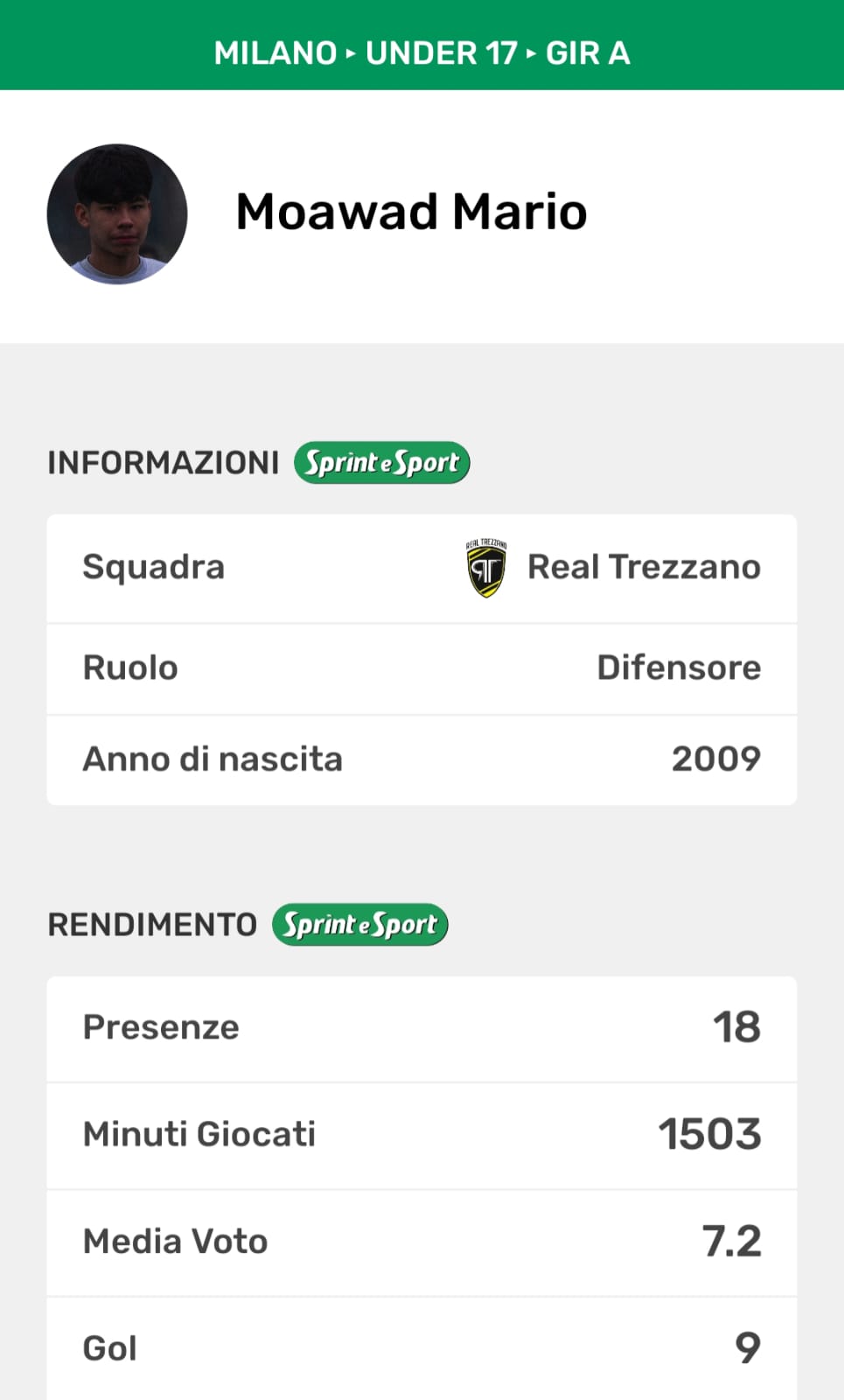 La natura delle persone, non la puoi cambiare. Quella di un giocatore, invece, al limite si maschera ma è destinata a rimanere, fosse anche nell'angolo più buio della mente e del corpo dello stesso. E di certo, nella testa del Mario Moawad difensore, quella capacità di attaccare lo spazio e far gol non è mai andata via, è solo mutata passo passo con la sua carriera. Ma c'è, eccome se c'è, o il classe 2009 della Real Trezzano non sarebbe il difensore con più gol di tutta l'Under 17 meneghina, rappresentando un vero e proprio valore aggiunto alla fase offensiva dei gialloneri. Ma tant'è, perché da quando ha iniziato a giocare circa 12 anni fa, segnare è sempre stata un parte importante di un giocatore che dopo più di un decennio, si è evoluto in un mix che sta mostrando i primi segni di quanto possa essere devastante.