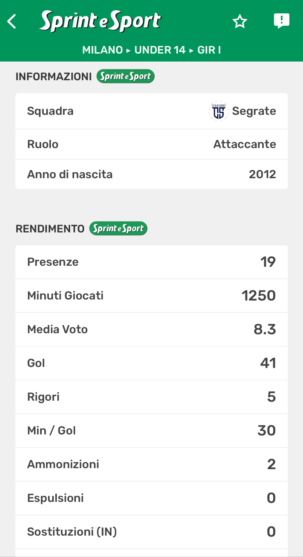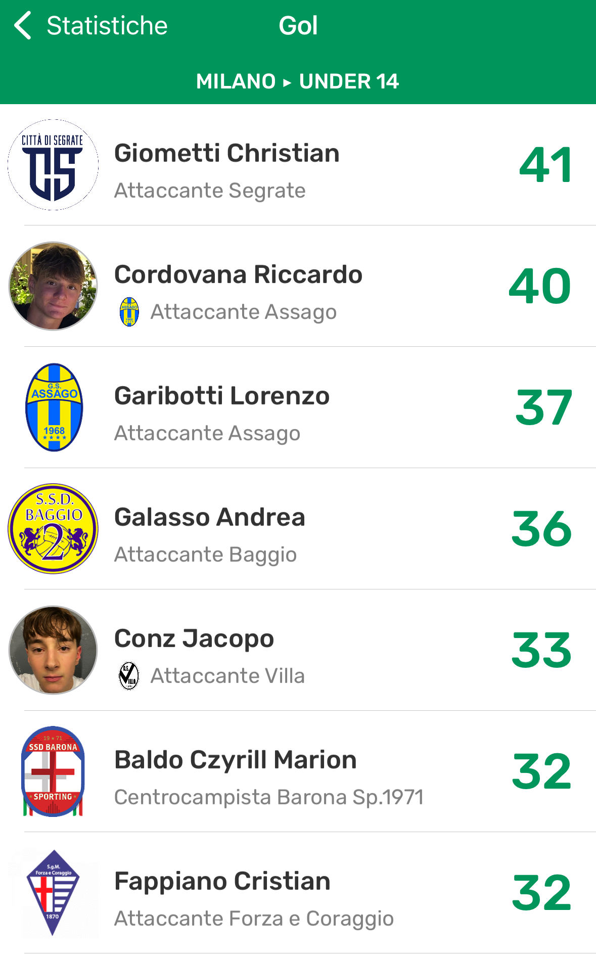 Si parlava di Alex Del Piero, dell'iconico gesto tecnico che porta il suo nome. Impossibile non notare la sostanziale differenza con il più recente "tir a gir" di Lorenzo Insigne: il primo è un gol, il gol alla Del Piero, l'essenza del calcio, una conclusione mirabolante che si tramutava in rete con parabole sognanti, il secondo un semplice tiro, un gol in potenza, un "forse". E si cita il leggendario capitano della Juventus per sottolineare come sia fondamentale il risultato nel calcio, non tanto l'estetica, che certamente rende il gesto tecnico più bello, ma che sostanzialmente non aggiunge nulla a quello che rimane comunque un gol. E Christian Giometti lo sa bene, visto che ha segnato in quasi tutte le partite in cui è sceso in campo: 18 su 19 per l'esattezza, un ruolino di marcia impressionante che ha portato il giovane cigno di Segrate a quota 41 reti in campionato, una cifra che lo pone, per il momento, in vetta alla classifica marcatori di tutta la categoria Under 14 di Milano. Se la giocherà fino alla fine con i due ragazzi dell'Assago, un'altra corazzata da Regionali, Cordovana e Garibotti, al momento infortunato, Galasso del Baggio e tutti gli altri cannonieri nel ranking.