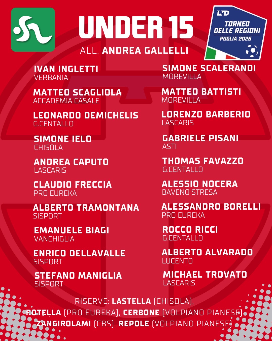 Ci siamo, l'attesa è finita. Il Torneo delle Regioni 2026 è alle porte e il Comitato Piemonte-Valle D'Aosta ha diramato le convocazioni ufficiali delle quattro rappresentative pronte a volare in Puglia. L'Under 15, coordinata da Massimo Storgato e allenata dal selezionatore Andrea Gallelli, ha oggi definito la lista dei 20 giocatori che partiranno per la missione nazionale.