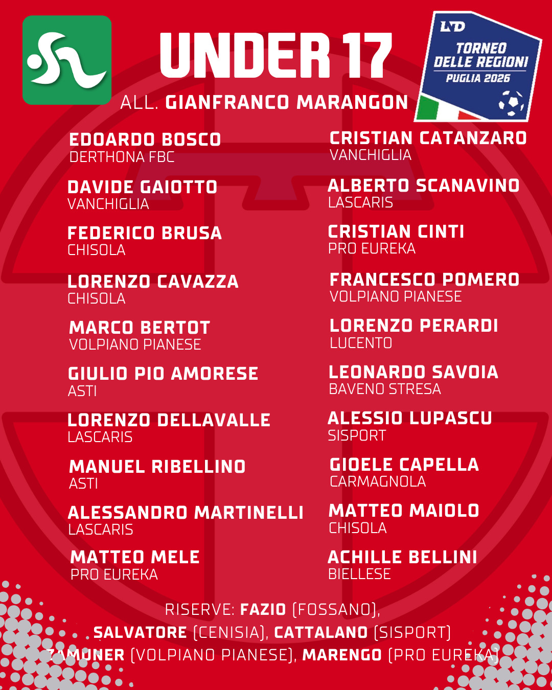 Finalmente è arrivata l'ora del Torneo delle Regioni 2026! A dire il vero manca ancora qualche giorno al 28 marzo, data di esordio del Torneo delle Regioni 2026 in Puglia, ma il Piemonte VDA ha già diramato la lista dei 20 convocati classe 2009 che difenderanno i nostri colori nella manifestazione giovanile più attesa dell'anno. A questi nomi selezionati da Gianfranco Marangon se ne aggiungono 5 di riserva, che possono essere chiamati a partire in direzione Puglia in qualsiasi momento qualora lo staff lo ritenesse opportuno.