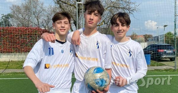 UNDER 15 LA DOMINANTE • Riccardo Deidda e Alessandro Meriggi ai lati di Diego Farina, autore della tripletta che chiude i conti.