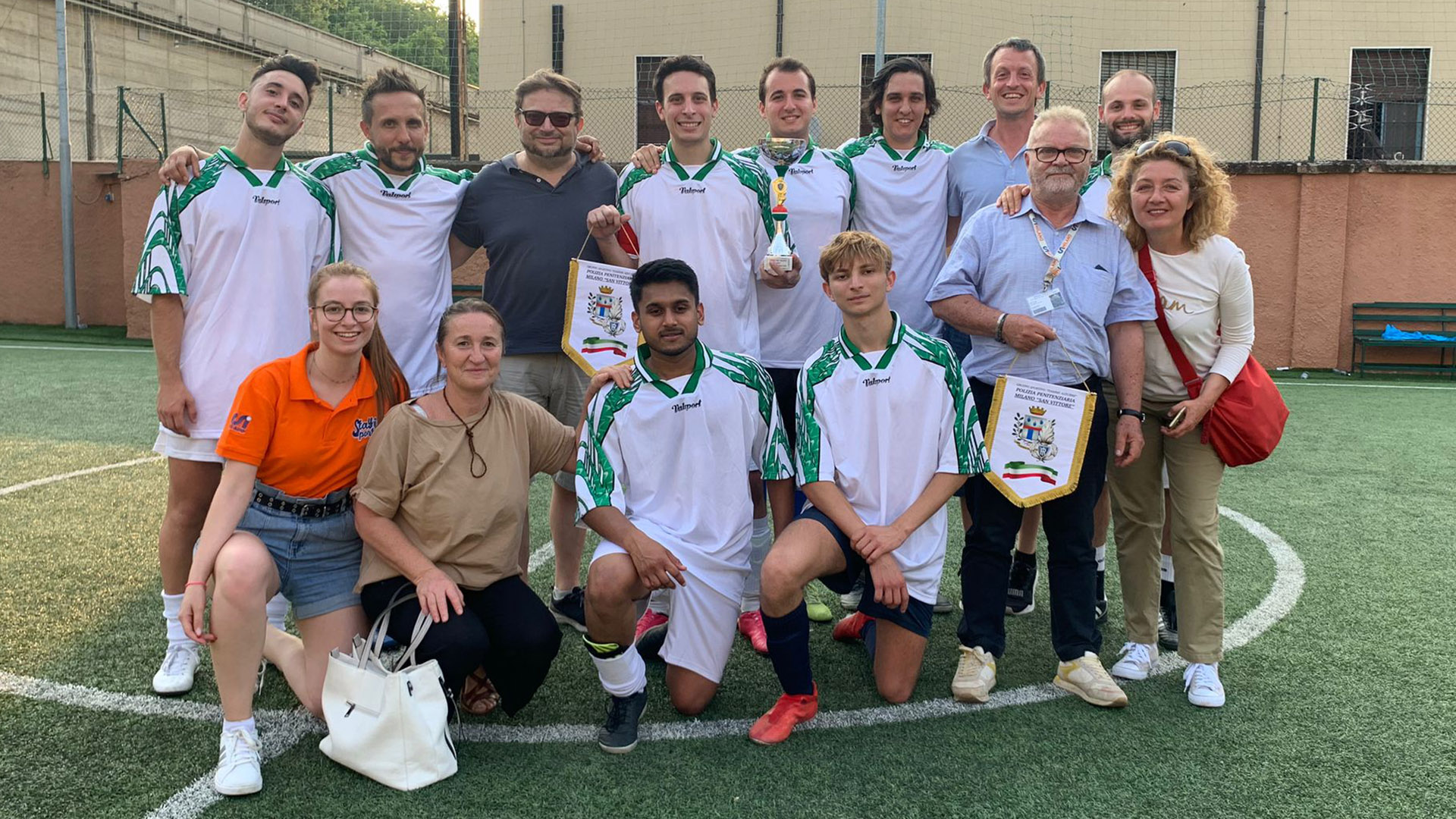 Fischio d’inizio alle 17 circa: torneo di calcio a cinque, un tempo da 20 minuti per ogni partita e sei squadre partecipanti. Ovviamente presenti le rappresentative della Polizia Penitenziaria di San Vittore e dell’associazione Cascina Biblioteca, a cui si sono unite anche le squadre del Comune di Milano, dell’Ordine degli Avvocati, della Camera Penale e del CSI. Le sei squadre sono state divise in due gironi e le prime classificate dei due raggruppamenti si sono giocate poi la finale per il primo posto. L’ultimo atto ha visto in campo la Polizia Penitenziaria e il CSI, con la vittoria di questi ultimi al termine di una partita esaltante, anche grazie alla telecronaca live di Fabio Pizzul, figlio di Bruno, che per tutto il pomeriggio ha accompagnato e commentato le azioni delle gare di calcio del torneo. Dopo l’ultimo match è arrivato poi il momento delle premiazioni e del buffet a cui hanno partecipato tutti i protagonisti sul campo e gli altri presenti.