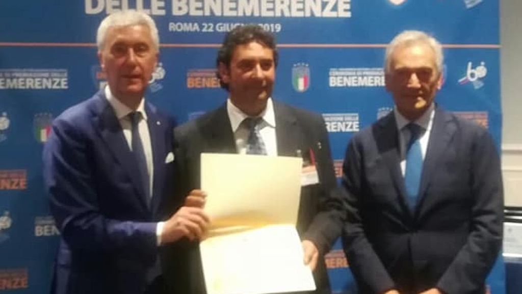 22 giugno 2019 • Giuseppe Favatà (al centro) premiato da Cosimo Sibilia e Gabriele Gravina per i 100 anni di attività del Sempione Half