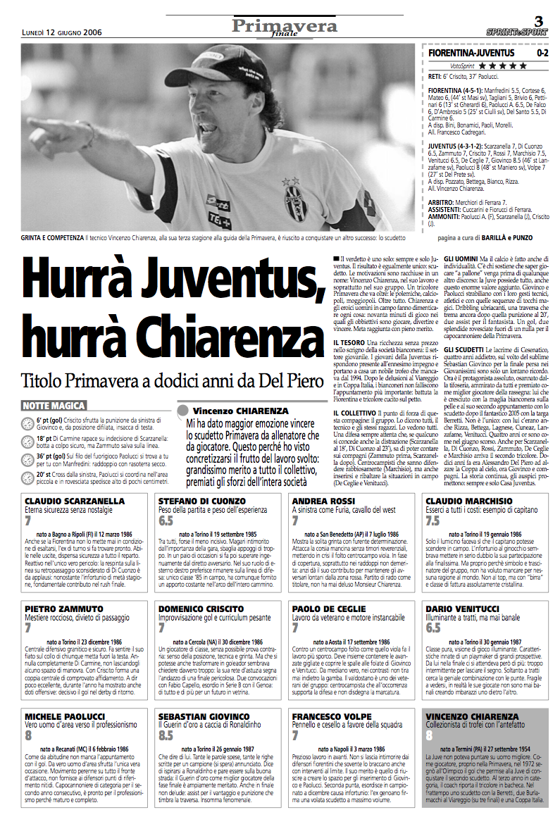Paolo Montero arriva così sulla panchina della Primavera della Juventus, categoria dove, a dispetto dei tanti talenti lanciati e che 'frequentano' i campi di Serie A e Serie B e mezza Europa, lo Scudetto e il Tricolore mancano ormai dal lontanissimo 2006. Scudetto Primavera che è una vera e strana rarità in casa bianconera, vincitrice nel '94 (con in panchina Antonello Cuccureddu e in campo un 'certo' Alessandro Del Piero) prima dell'ultimo sigillo del 2006 e per altre 'sole' due volte nella storia: nel 1963 e nel 1972. Riavvolgendo il nastro della memoria, spunta dunque quel Tricolore targato 2006, con in panchina lo storico maestro e condottiero, Vincenzo Chiarenza. Era la stagione 'dell'orgoglio' bianconero che proprio in quell'anno vide scritta, sul campo e non solo, una pagina indelebile della propria storia. Uno Scudetto vinto con in campo la splendida e miracolosa 'leva del 1987', quella dove figuravano Sebastian Giovinco, Claudio Marchisio, Paolo De Ceglie Mimmo Criscito e tanti giovani talenti. Per un tabù da sfatare e una coccarda da ricucirsi sul petto. E una sorta di profezia: i pochi scudetti di categoria, sono stati conquistati da due ex giocatori della Juventus, diventati poi anche allenatori di Signora...