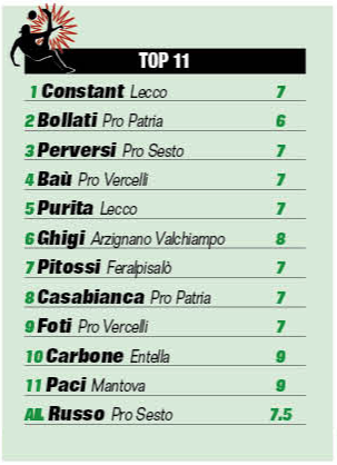 Piena soddisfazione invece per Nello Russo, dopo la vittoria della sua Pro Sesto sulla Pro Patria per 5-2: «Sono molto contento per la vittoria e soprattutto per la prestazione dei miei giocatori: abbiamo dominato il gioco per tutto il match, senza smettere di spingere neanche per un secondo. L'episodio fortunato dell'autogol sull'1-0 ci ha sicuramente dato una mano, ma la squadra è stata brava a sfruttare l’episodio per chiudere presto ogni discorso: nella ripresa poi abbiamo controllato bene il risultato e anche i subentrati hanno fatto molto bene, cosa che per un allenatore è la ciliegina sulla torta di un'ottima giornata». Nell’altra partita del girone secondo 4-0 consecutivo per l’Entella, questa volta sul Pontedera. Rinviata Lucchese-Pergolettese per indisponibilità del campo, riposa il Renate. Nel Girone B bella vittoria della Feralpisalò sul Pordenone dopo il pessimo avvio. Vincono anche il Vicenza (7-1 a Trento), la Triestina in casa contro il Padova e il Mantova che supera l’Arzignano Valchiampo per 4-2.
