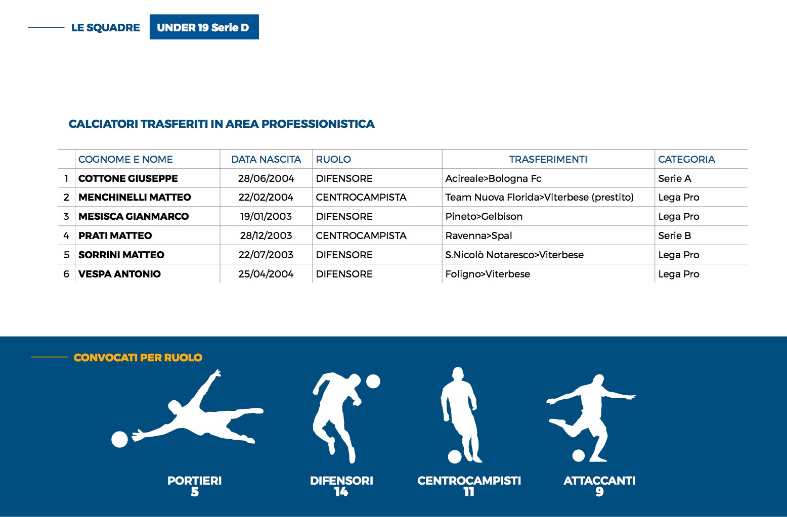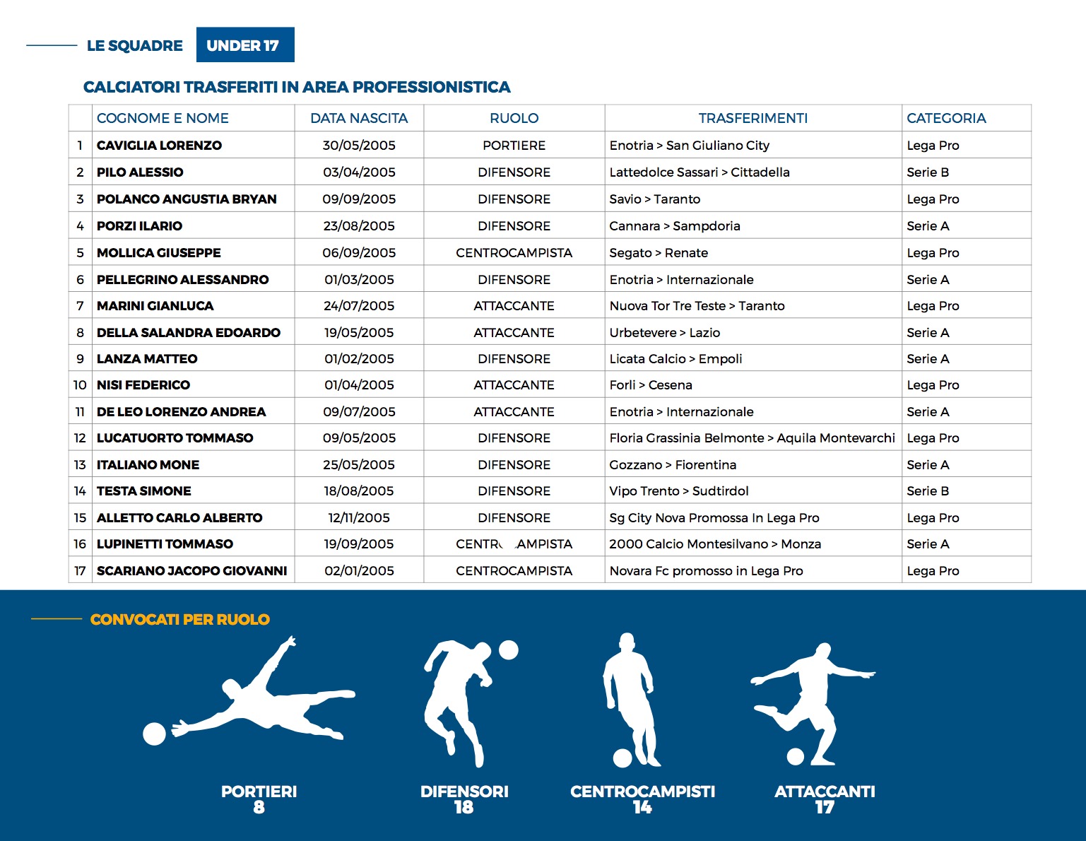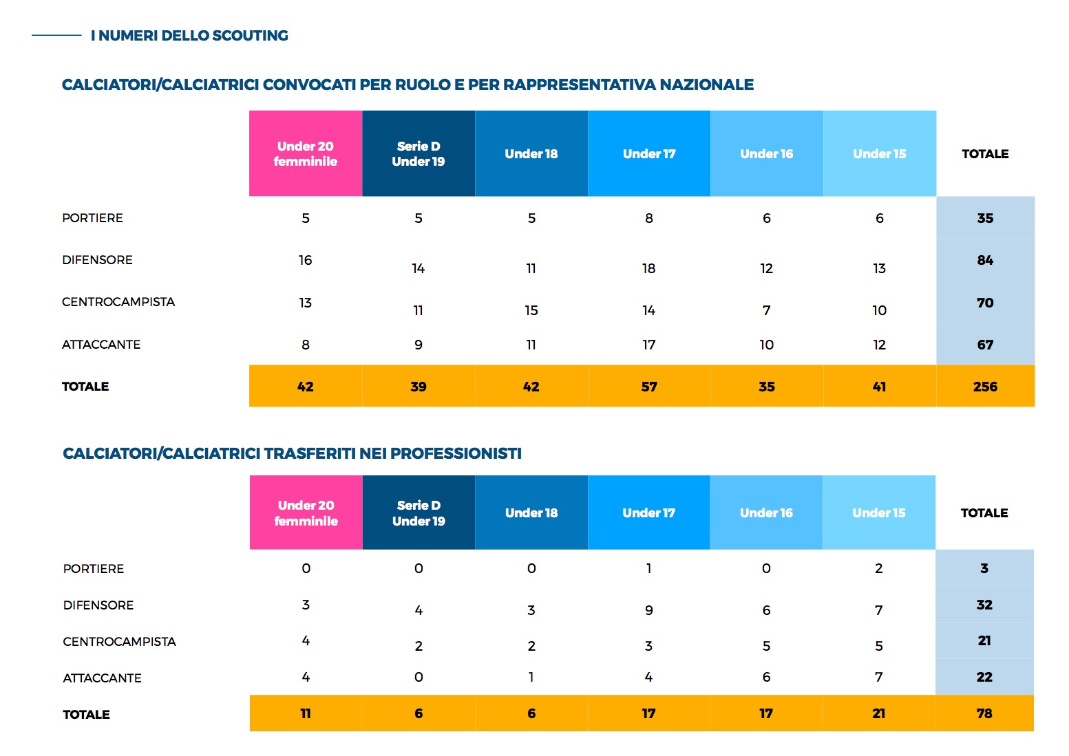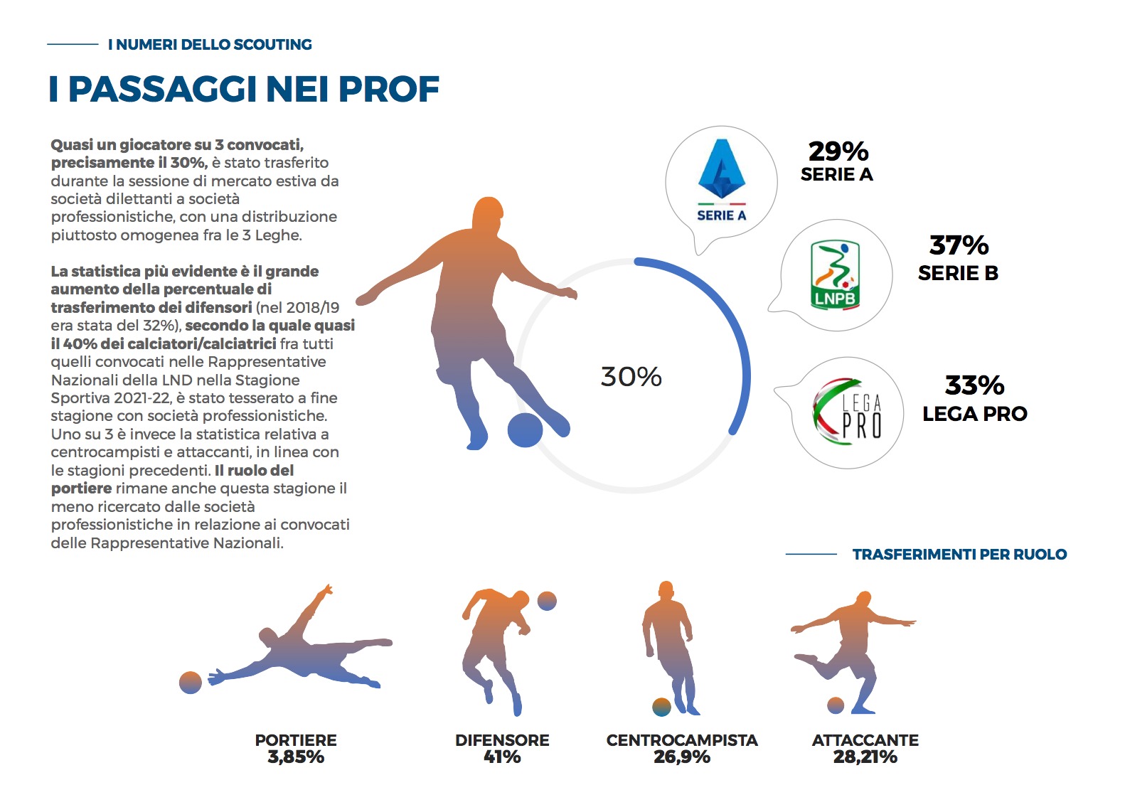 Dalla stagione sportiva 2014/15 a quella appena conclusa si evidenzia un trend di crescita costante dei calciatori convocati dalle Rappresentative Nazionali LND e trasferiti in società professionistiche. Il risultato anomalo della stagione sportiva 2015/16 è dato dal passaggio in Lega Pro tramite promozione di società storiche vincenti il campionato di Serie D. Il dato più importante riguarda la stagione 2019/20 segnata dall’inizio della pandemia, mentre quello relativo alla stagione 2020/21 non è stato rilevato per lo stop all’attività giovanile.