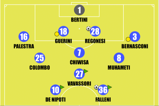 La formazione schierata da Fioretto: davanti riproposto il trio Vavassori-De Nipoti-Faleni supportato da Chiwisa, Muhameti e Colombo in mezzo al campo