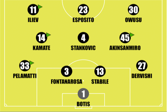 Il 4-3-3 di Christian Chivu: tra i pali c'é Botis, la retroguardia è guidata da Fontanarosa, a centrocampo scelti Kamate e Akinsanmiro e, davanti spazio al tridente Iliev-Esposito-Owusu
