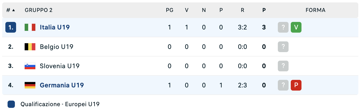 ITALIA (4-3-3): Mastrantonio; Kayode, Stivanello, Mane, Regonesi; Pisilli, Faticanti, Lipani (34' st Kumi); D'Andrea (18' st Vignato), Esposito (34' st Raimondo), Hasa (44' st Missori). A disp. Palmisani, Chiarodia, Amatucci, Koleosho. All. Bollini.